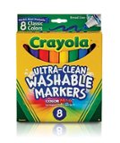 Make art with Crayola Classic washable markers. Each box comes with eight broad-tip markers in assorted colors that are made from recycled plastic, and they easily wash off of skin, clothes or walls. These Crayola Classic washable markers have cone-shaped tips that make it easy to color thin or thick lines that don't run through to the other side of the paper