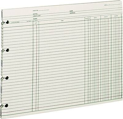 Ensure your accounts stay in perfect order with these Wilson Jones end-balance ledger forms. These green-colored forms measure 9 1/4 inches by 11 7/8 inches and are punched with 5/16-inch diameter holes for convenient filing in post binders. The 24-pound ledger paper resists tearing and ink bleed for easy maintenance of hand-written accounts over many years. A pack contains 100 ledger forms printed on both sides with 7 1/8-inch outer centers and adequate line spacing to keep writing legible.