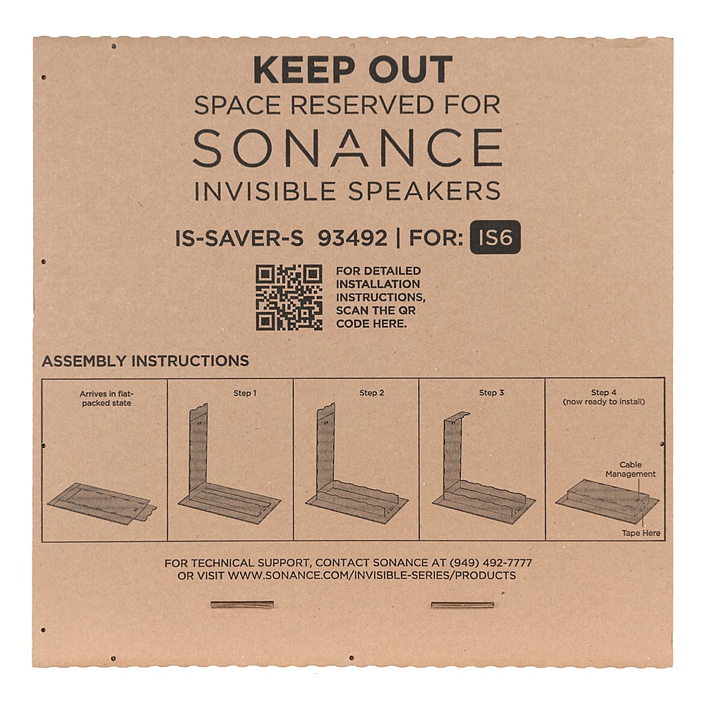 Sonance Invisible Series Space Savers are easy to transport and are reusable and recyclable. At the appropriate time, the speaker installer removes the Space Saver and replaces it with the Invisible Series speaker or subwoofer.