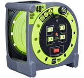 The Masterplug 40ft cord reel provides 1560W of power with 4 120V 13amp sockets, LED power indicator, power switch, and a built-in thermal breaker with reset button. Wall mount using integrated keyhole slots allow for easy storage mounting. The compact and easily portable reel is perfect for home, yard, or motorhome use.