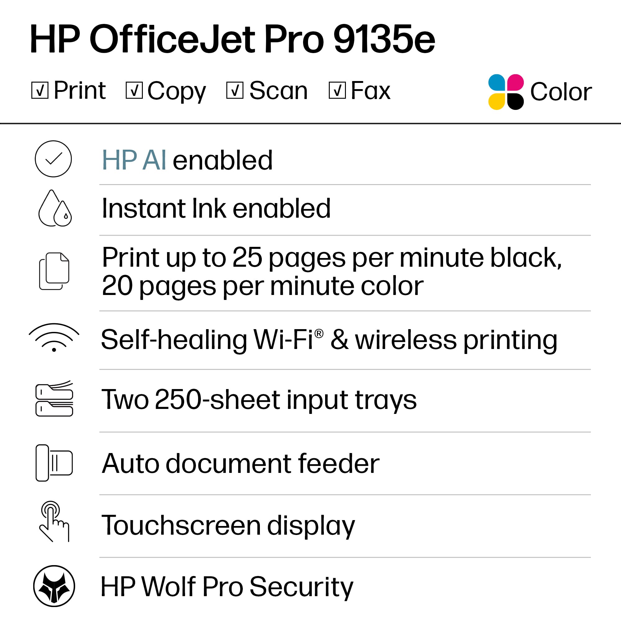 The HP OfficeJet Pro 9135e delivers fast color printing, 500-sheet paper capacity, and duplex scanning and copying. It's AI-enabled to intuitively adapt to your workflow, with wireless and security features that keep your multifunction printer up to date and secure.