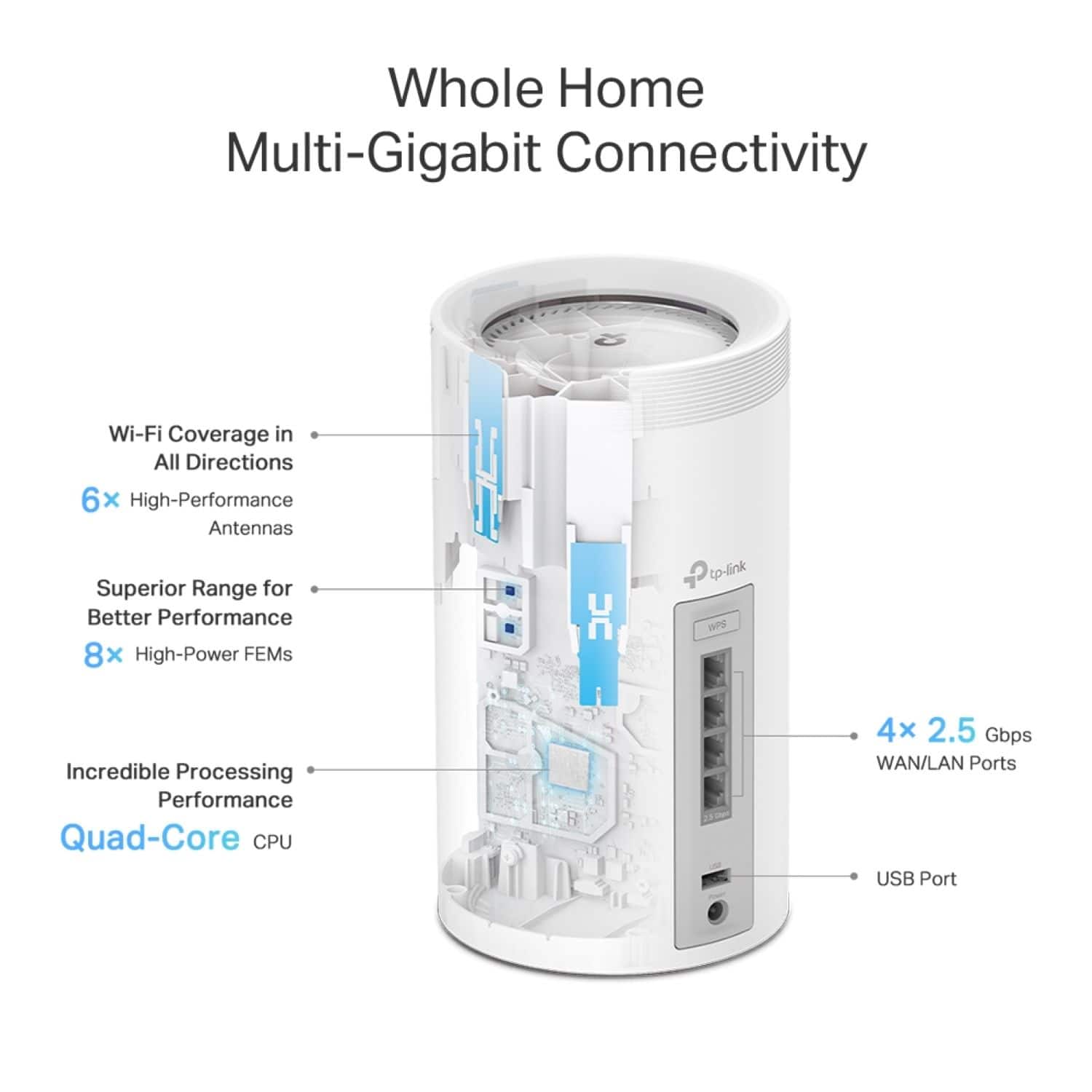 Experience a Whole Home WiFi 7 Mesh system with 16 Gbps 8-Stream Quad-Band WiFi. With 6 GHz connections and 320 MHz bandwidth, the Deco BE16000 removes frustrations caused by overcrowded WiFi networks. 4× 2.5 Gbps ports maximize home internet speeds with up to 2.5× the wired speed of a typical Gigabit Ethernet port. Deco BE16000 can connect a wireless and wired backhaul with each unit simutaneously. What's more, with the latest WiFi 7 MLO technology, the system's wireless and wired combined backhaul aggregation flow rate is increased. This way, Deco BE16000(3-pack) offers whole home coverage up to 9,600 sq.ft. In addition, it automatically learns and self-improves with AI-Driven Mesh to provide a unique and ideal Mesh WiFi for your home. Walk from room to room and enjoy seamless streaming. With TP-Link HomeShield, Deco BE16000 provides comprehensive network protection, robust parental controls, and real time IoT security.
