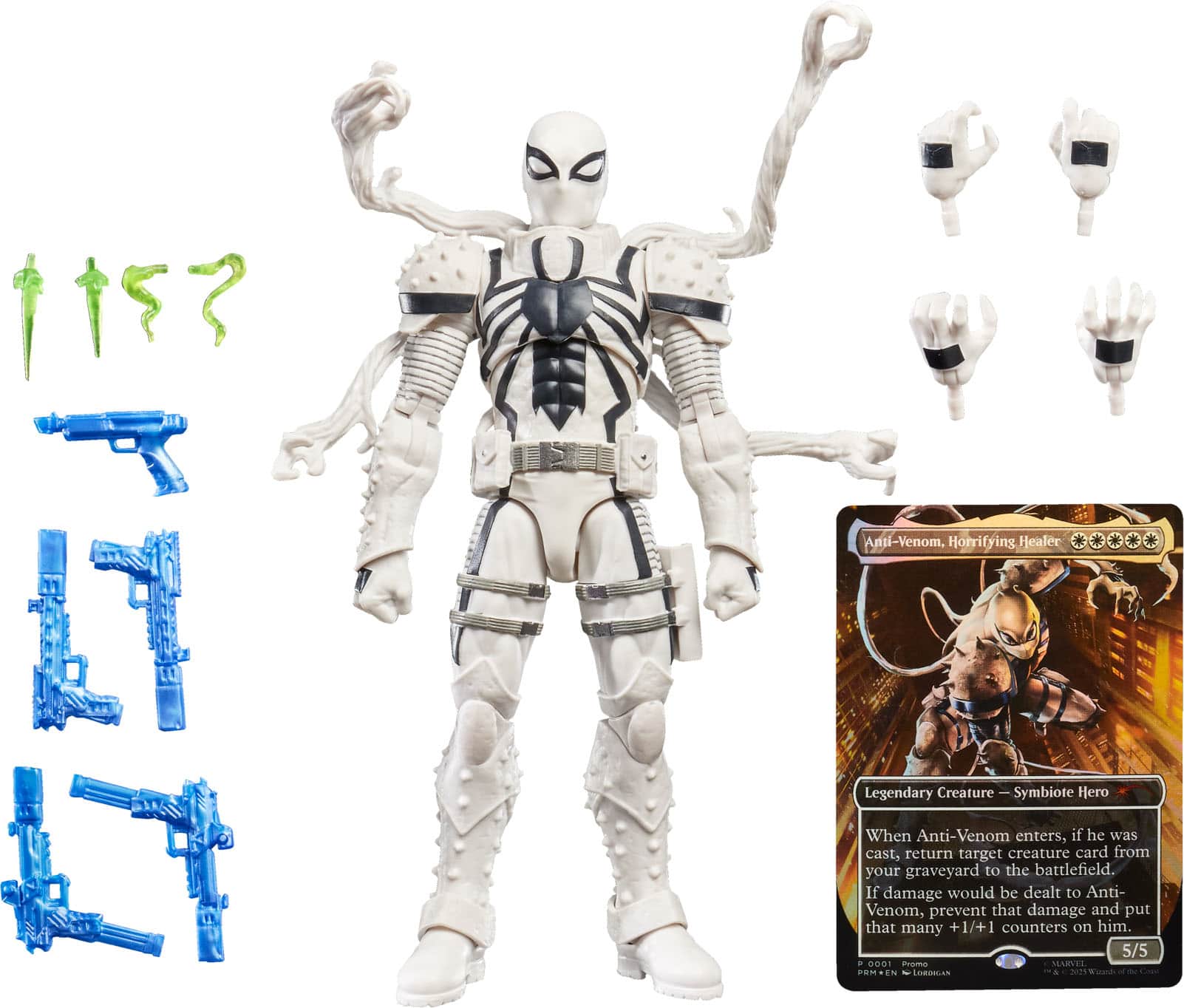 Bring the excitement and wonder of the Marvel Universe to your collection with Hasbro Marvel Legends Series Magic: The Gathering Agent Anti-Venom figure and enhance your Magic deck with a playable card! Detailed to look like the character’s appearance in Marvel’s Spider-Man comics this collectible 6-inch scale Agent Anti-Venom figure is fully articulated with poseable head, arms, and legs. This Marvel action figure set comes with 14 accessories, including alternate unmasked head, 2 thwip hands, 2 wall-crawling hands, web line, and web shield; plus an exclusive foil Magic: The Gathering | Marvel's Spider-Man card to expand your spider-collection! Hasbro Marvel action figures' 6 inch scale make them great for posing and displaying in fans' collections. Reimagine Spider-Man comics-inspired scenes on your shelf with Marvel Legends action figures. Copyright 2025 MARVEL. Copyright 2025 Wizards of the Coast LLC. Hasbro and all related terms are trademarks of Hasbro.