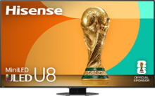 The Hisense U8 Series is an award-winning TV that makes for the ultimate game-watching experience. It’s enhanced with Mini-LED Pro technology, reaching up to 5,000 nits peak brightness for even sharper contrasts, brighter lighting and more dramatic shadows. Soak up over a billion vibrant shades on your screen with QLED Color. The 165Hz Native Refresh Rate and Anti-Glare Low Reflection Pro panel technology helps you see it all clearly without any interference. And Dolby Atmos along with an up to 82W 4.1.2 Multi-Channel Audio System bring all the sounds of the cinema right to your living room.