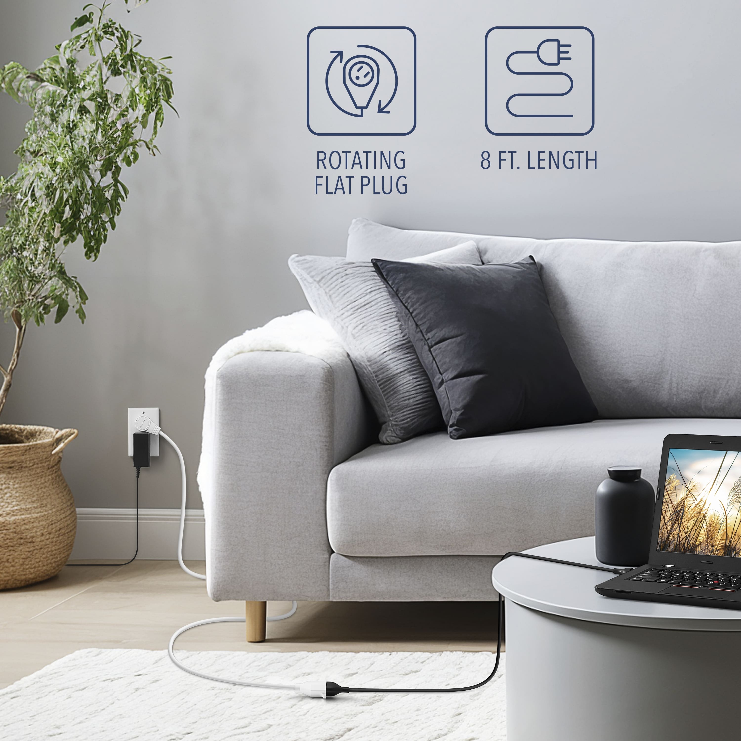 Provide power to hard-to-reach devices with the Insignia 8’ 16 AWG Indoor Extension Power Cord with Rotating Plug. A 16 AWG, three-prong construction works with a wide-range of devices, granting a secure fit for optimal safety and compatibly. Add up to 8 ft. of length and reach into tight corners with a lay-flat plug that sits flush against the wall and rotates to suit your needs.