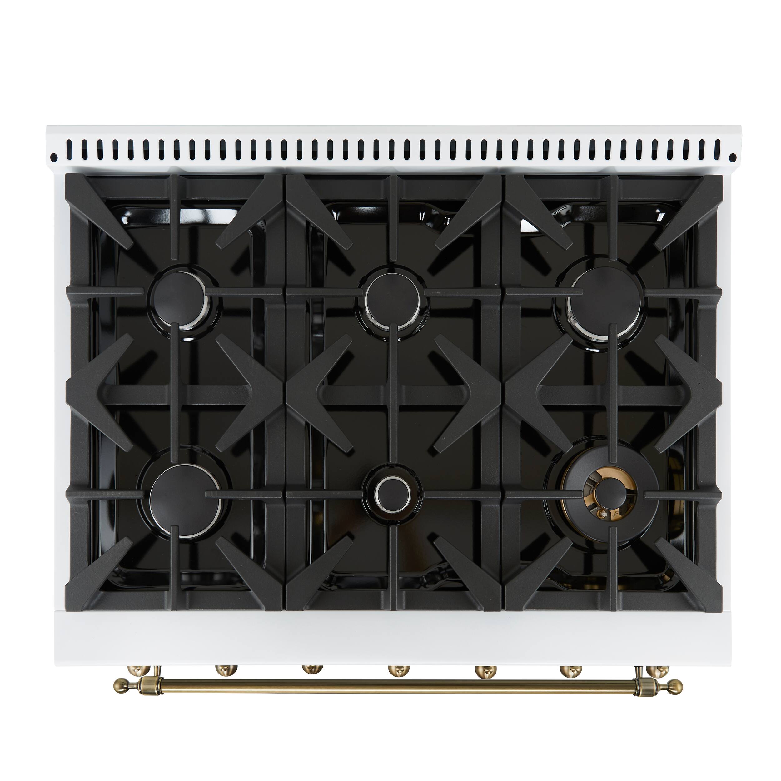 Discover the perfect combination of style and functionality with the Forno Antico 36-Inch Gas Range in white. Featuring 6 sealed burners with a total output of 71,000 BTU, this range delivers exceptional cooking power. The dual-ring brass burner provides up to 20,000 BTU for searing and 1,000 BTU for simmering, offering precise control for any dish. Its spacious 4.5 cu.ft. convection oven ensures even baking and roasting. With a sleek white finish and antique brass accents, this range adds timeless elegance to your kitchen. Continuous cast-iron grates provide stability, while the recessed enamel cooktop makes cleaning easy. Backed by Forno's 2-year warranty, the Antico Gas Range is designed to inspire your culinary creativity. Forno, lower the cost of living.