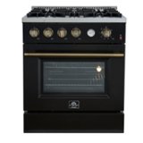 Bring bold design and culinary power to your home with the Marco 30 Inch Alta Qualita Gas Range in sleek black with antique brass accents. Whether you're simmering delicate sauces or searing a juicy steak, the 4 sealed burners, including a dual-ring burner with 37,000 BTU output, meet every need. The 4.32 cu.ft. convection oven guarantees evenly baked cookies and perfectly roasted vegetables. Durable cast iron grates provide stability, while smooth friction hinges and a triple-layer oven door ensure safety and efficiency. Reliable and visually striking, the Marco makes every meal an occasion. Lower the cost of living with Forno.