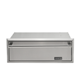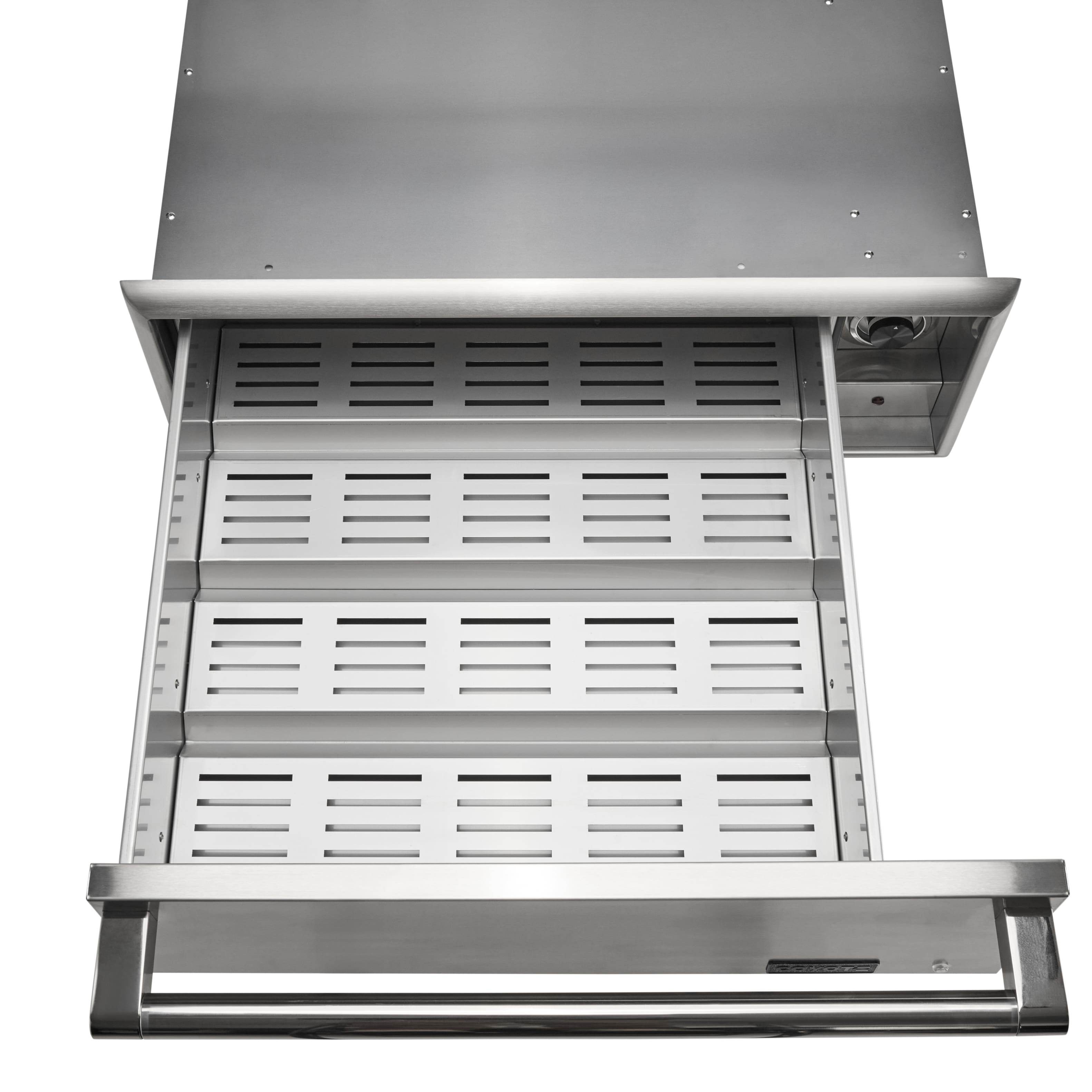 This outdoor rated Coyote warming drawer is designed to keep cooked food at serving temperature until the meal is ready to serve.