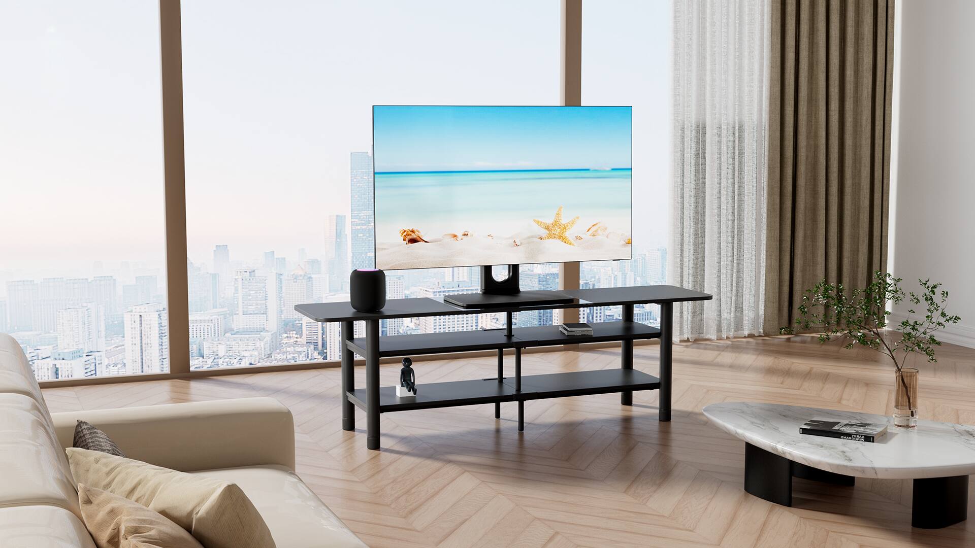 Extra Large Tabletop TV stand for TVs 46”-86”. Multiple height adjustments enable your TV to be adjusted for your perfect viewing height. This stand is made from high-quality and heavy-duty materials. Safety Straps are included. Maximum capacity is 150 lbs. ERTSX2 also has a storage compartment that allows an Apple TV or Roku device to be stored inside. Integrated cable management allows for a seamless TV stand with swiveling capabilities.