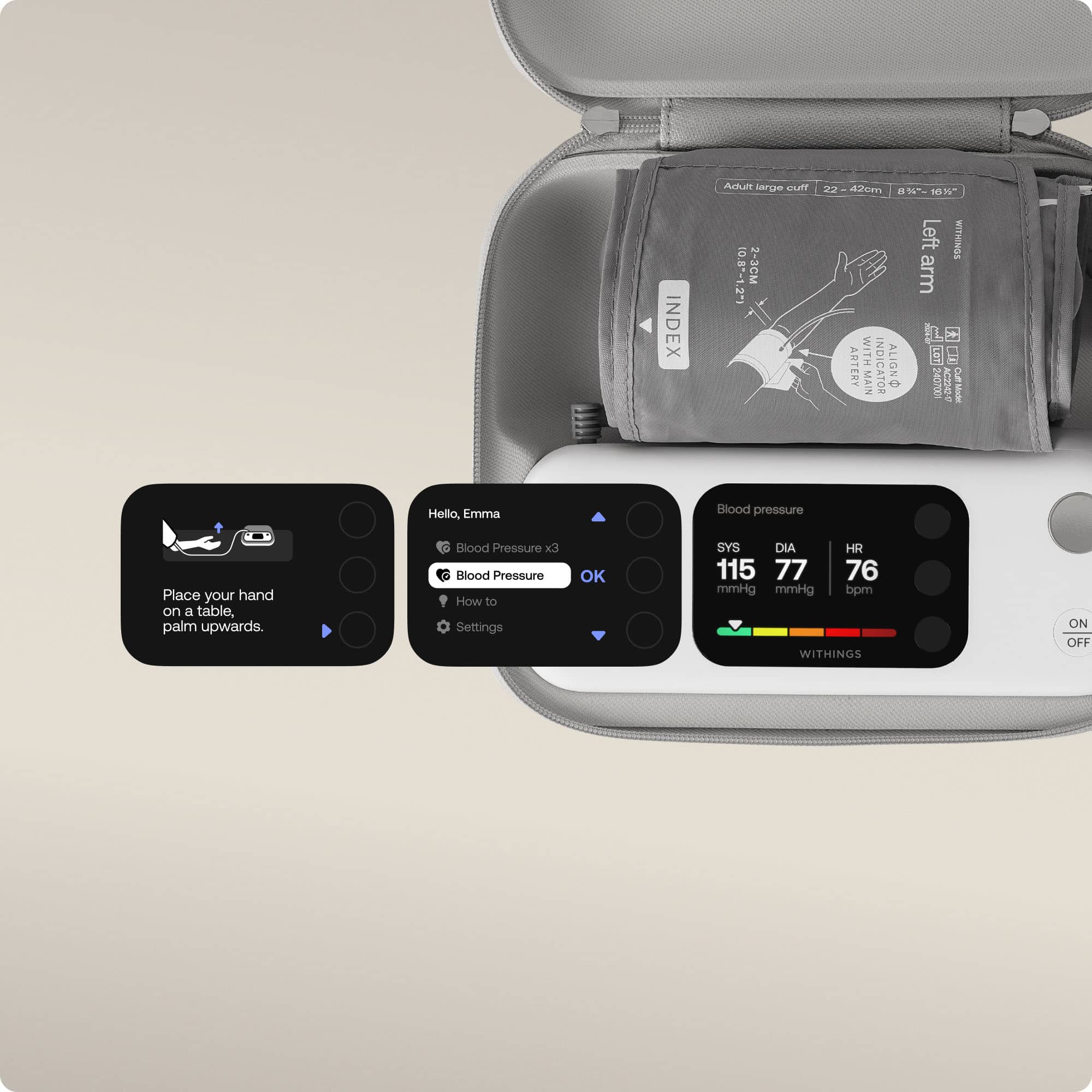 Withings BPM Vision is an FDA-cleared digital blood pressure monitor for home use that delivers precise systolic & diastolic measurements, heart rate tracking, and instant color-coded feedback—all displayed on a 2.8” high-resolution LCD screen. Your results are immediately visible, making health tracking effortless.