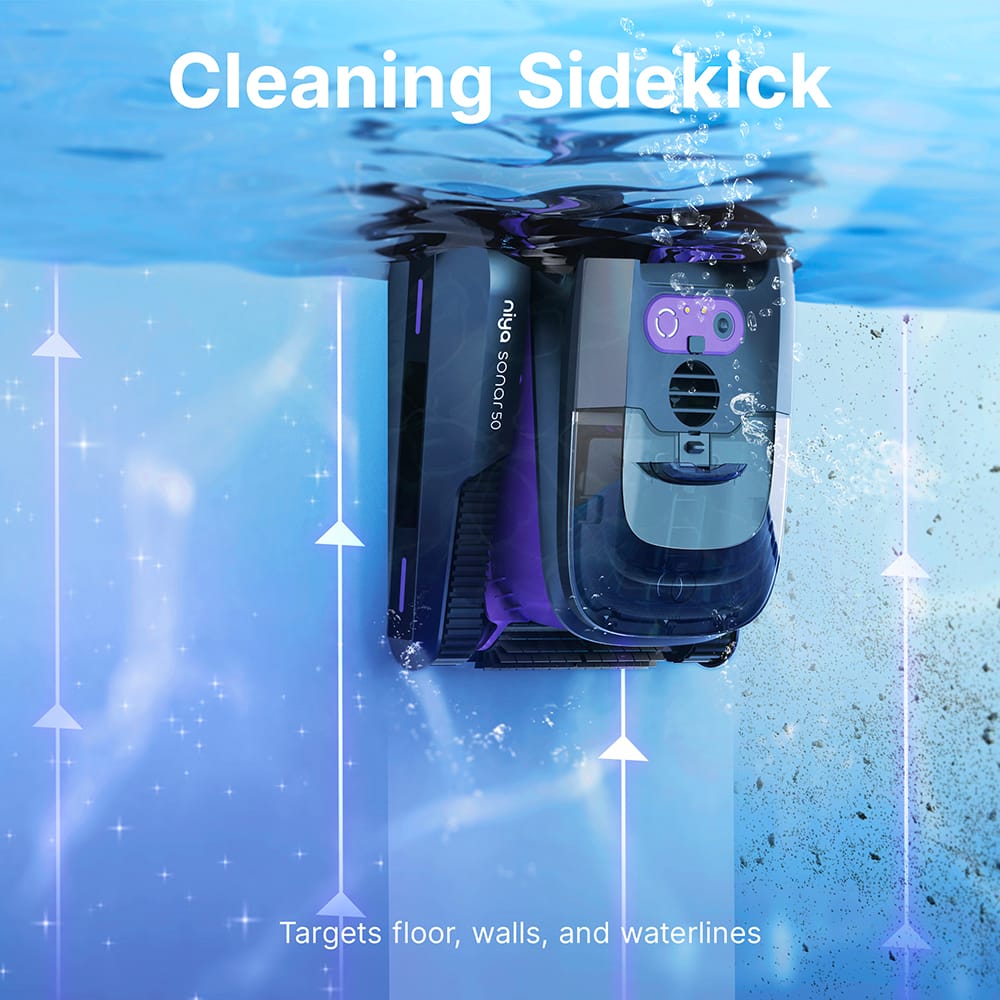 Get ready for pool bliss with the Niya Sonar 50, from the creators of Dolphin! These cordless cleaner scrubs floors, walls, and waterlines, and now you can steer the fun with app control. Its dual brushes and sonar tech make cleaning smarter and faster. Perfect for pools up to 40 ft., Sonar 50 is your Wi-Fi-connected sidekick for crystal-clear pool days.