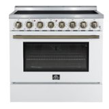 On sale • save 47%The Forno Paolo 36 Inch electric range in white with antique brass knobs and handles combines power and style for the modern kitchen. Its smooth ceramic glass cooktop features five radiant elements with 9,800 watts of total output. The 5.44 cu. ft. true convection oven delivers fast, even results with a 1,200-watt fan and 3,000-watt high-powered baking and broiling elements. A hidden bake element, bright halogen lights, and a large viewing window add convenience. This freestanding electric range also includes a 100-watt warming zone and dual-element broiler for precise, high-heat cooking.