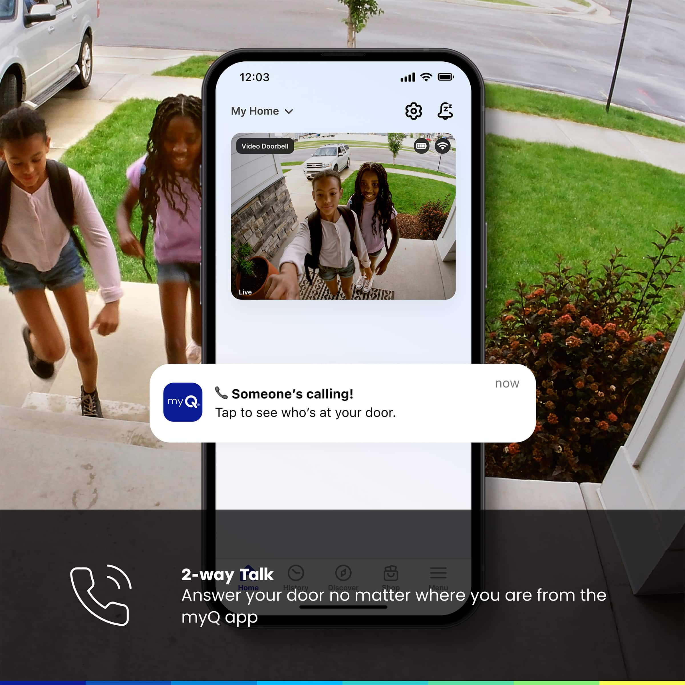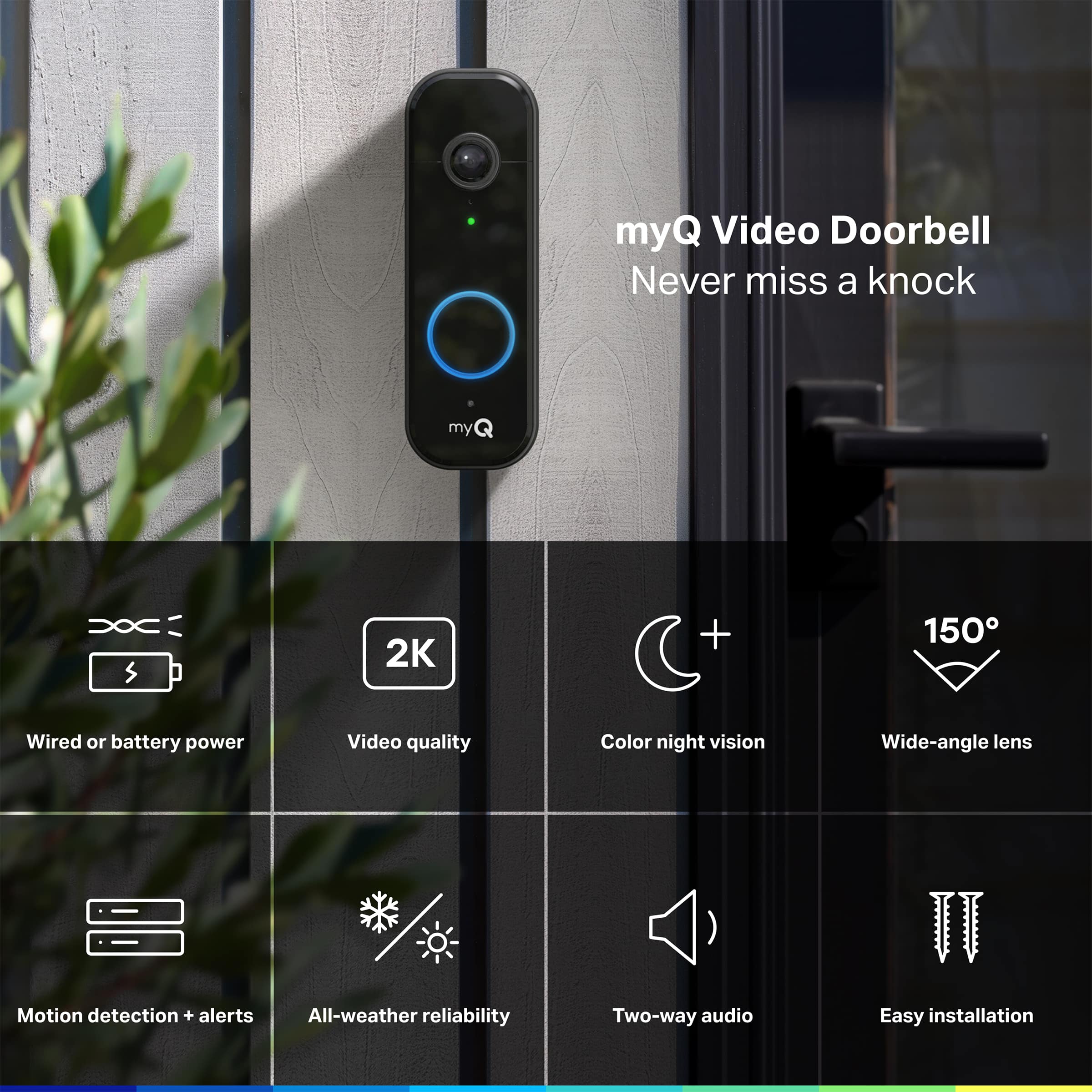 Stay connected to your front door with the myQ Video Doorbell. This doorbell captures every detail with 2K video, a 150° wide-angle lens, and Color Night Vision for 24/7 visibility. Motion alerts keep you informed so you never miss a visitor. Enjoy flexible wired or wireless installation for easy setup. Built to withstand extreme temperatures, the myQ Video Doorbell delivers peace of mind year-round, ensuring you see, hear, and respond to visitors from anywhere.