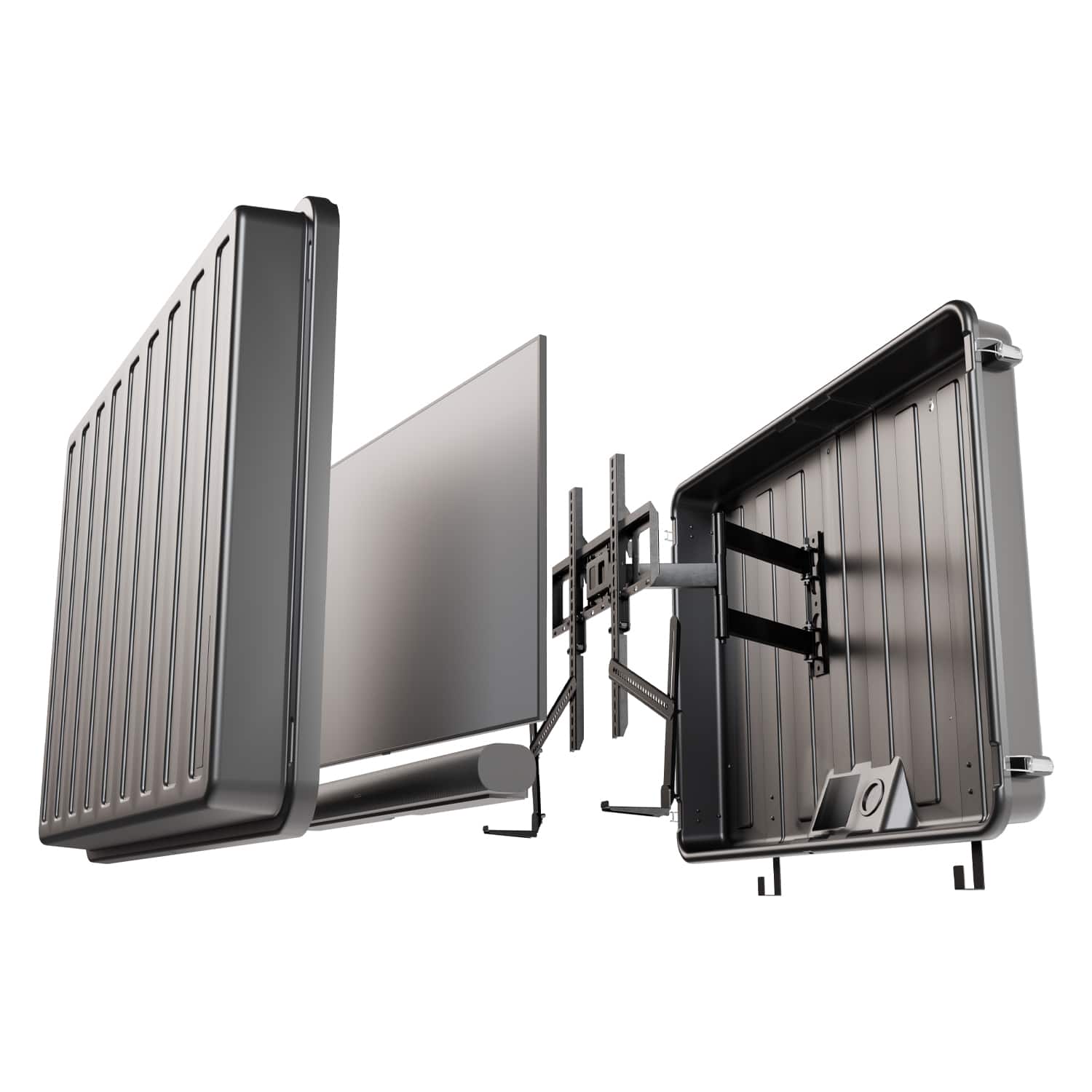 Storm Shell’s new XL edition provides year-round weatherproof protection for BOTH your flat screen TV and now your sound bar! The extendable, articulating TV and soundbar mount is included. The patented Storm Shell design is both impact and UV resistant. The front cover is easily removed and locked and secured when not in use. The extendable, full-motion articulating TV mount extends and swivels 180 degrees for unimpeded viewing and sound. The wall mounting bracket is also included.