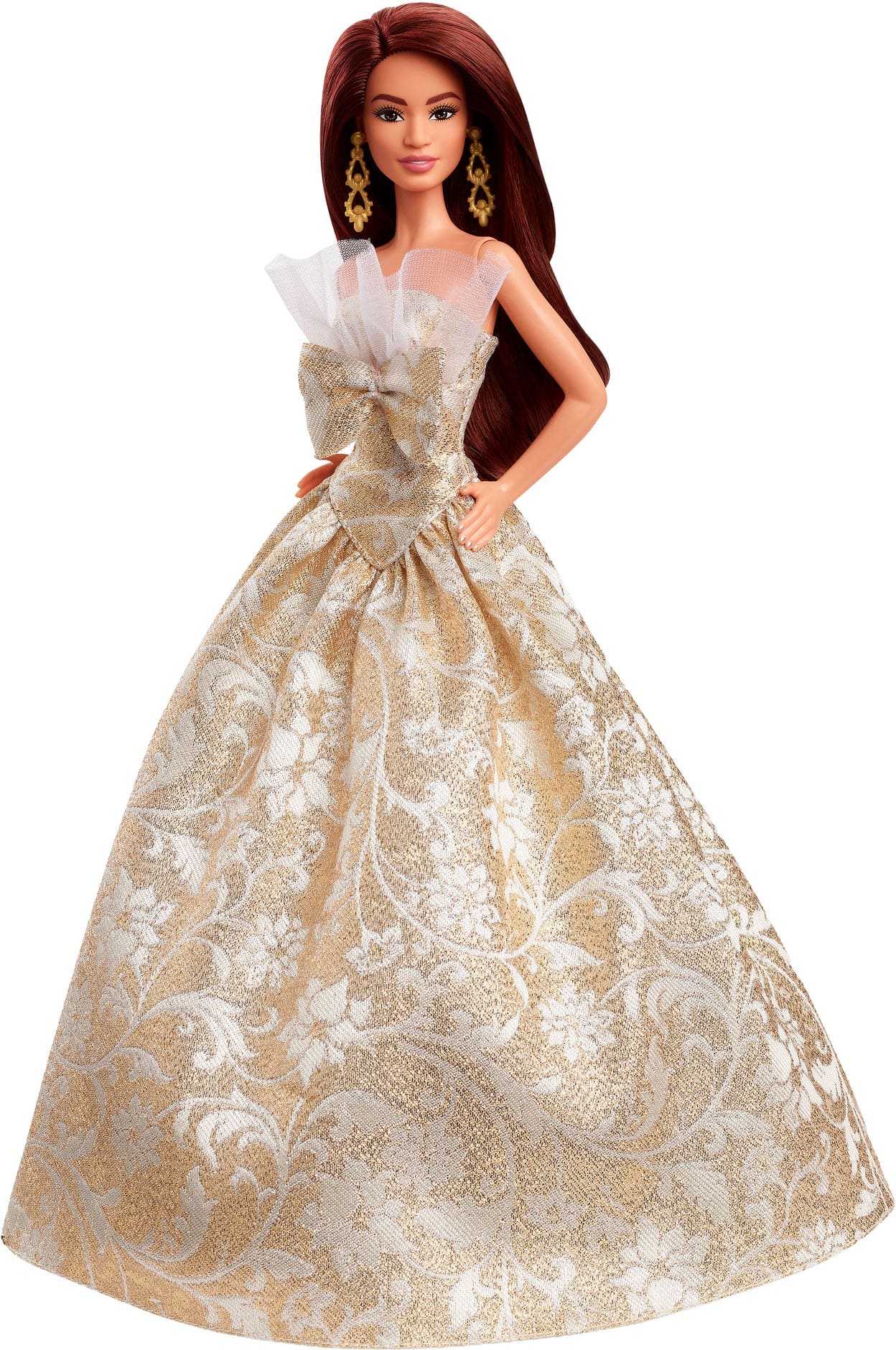 The 2025 Holiday Barbie doll shines like a star in and out of her packaging. Showcasing beautiful combinations of silver and gold damask print at the skirt, Barbie catches eyes in her gorgeous strapless gown, with a white, ruffle tulle trim at the collar. Barbie pairs her stunning gown with gold, drop earrings and pearlized gold heels. Her long beautiful, dark brown hair and makeup complement her classic look. In packaging that's ideal for display, this collectible doll is for fans 6-year-olds and up. Includes doll stand and Certificate of Authenticity.
