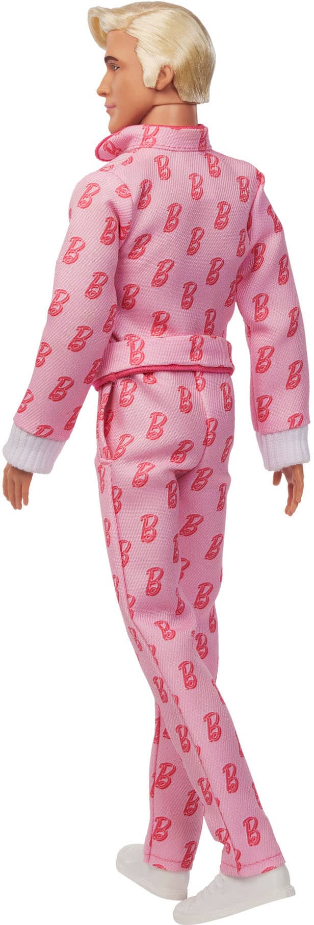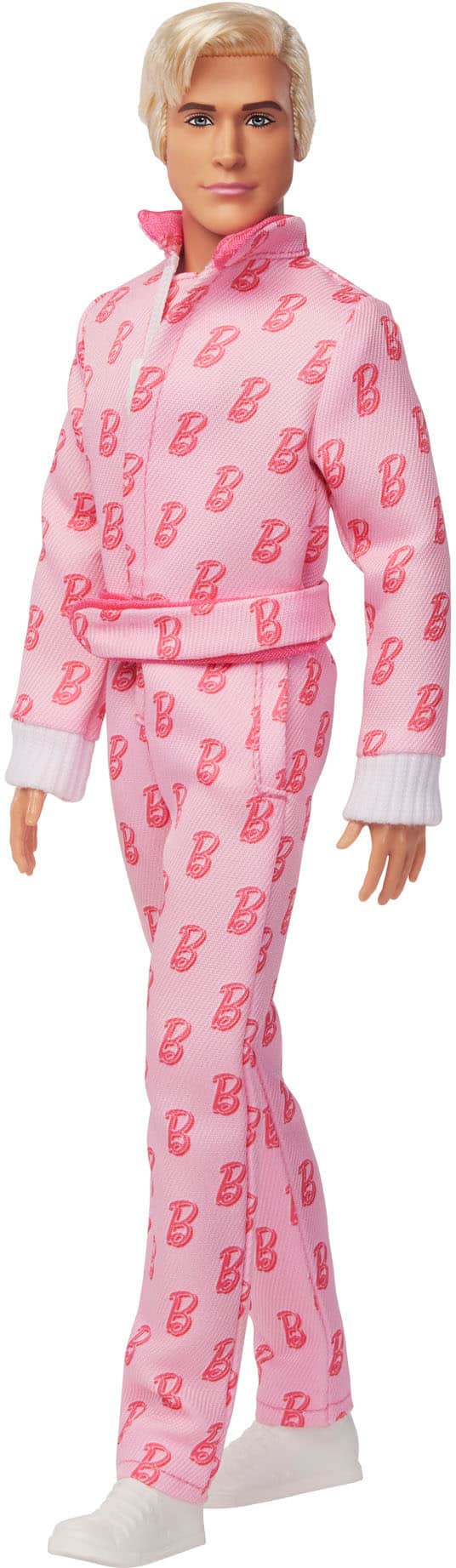 Greetings from Barbie Land! Modeled by Ryan Gosling's Ken character in Barbie The Movie, this collectible Ken doll wears a pink jumpsuit with a Barbie "B" symbol throughout. Inspired by the scene where Ken joins Barbie on her adventure to the Real World, the Ken doll includes his iconic roller skates -- just in case he needs them -- while wearing his signature white sneakers! With his platinum blonde hair, he captures all of Ken's signature style!