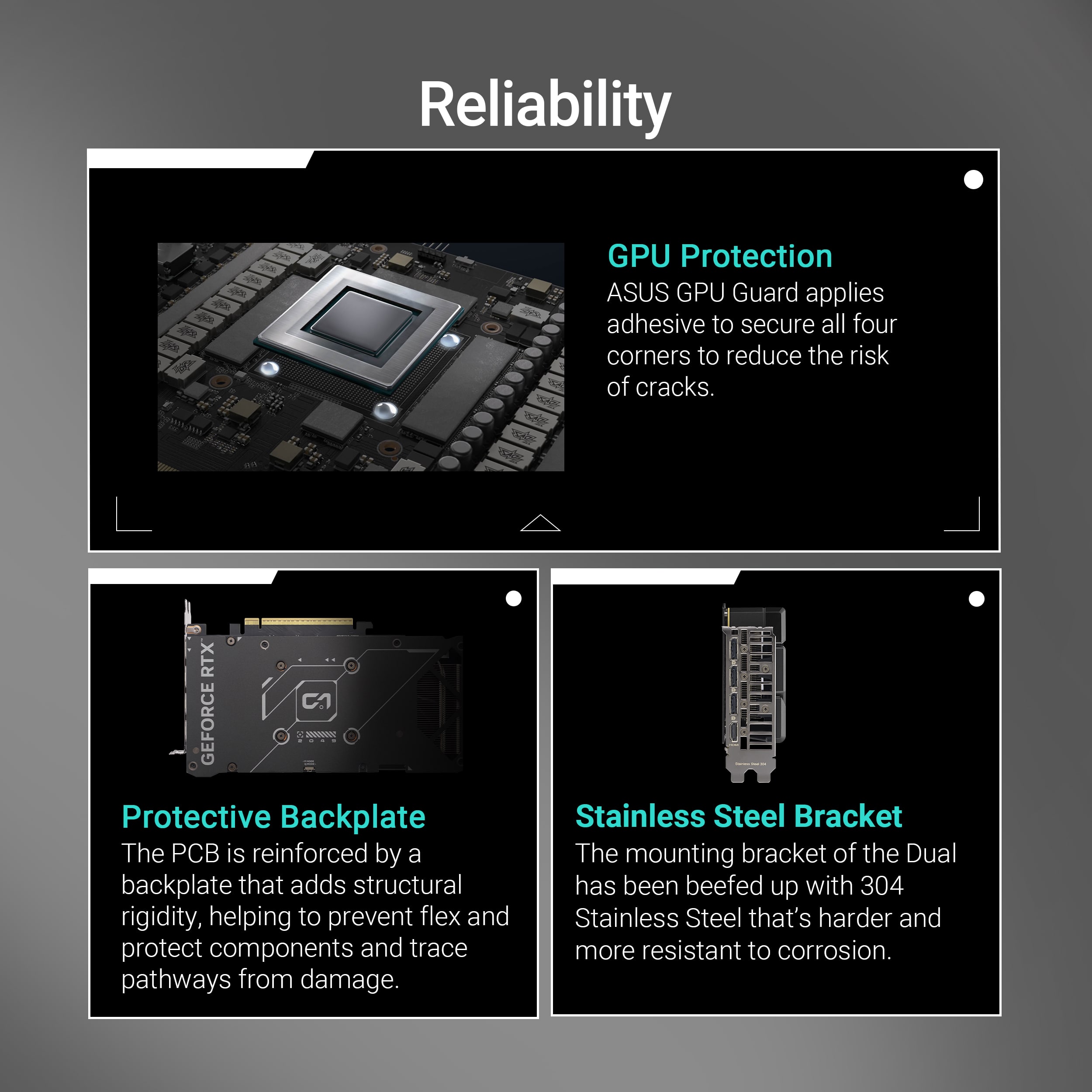ASUS DUAL GeForce RTX™ 5060 Ti OC Edition combines powerful thermal performance with broad compatibility. Advanced cooling solutions from flagship graphics cards — including two Axial-tech fans for optimizing airflow to the heatsink. Designed in a compact 2.5-slot form factor, delivering more power in less space. ASUS DUAL is a perfect choice for gamers who want heavyweight graphics performance in a compact build.