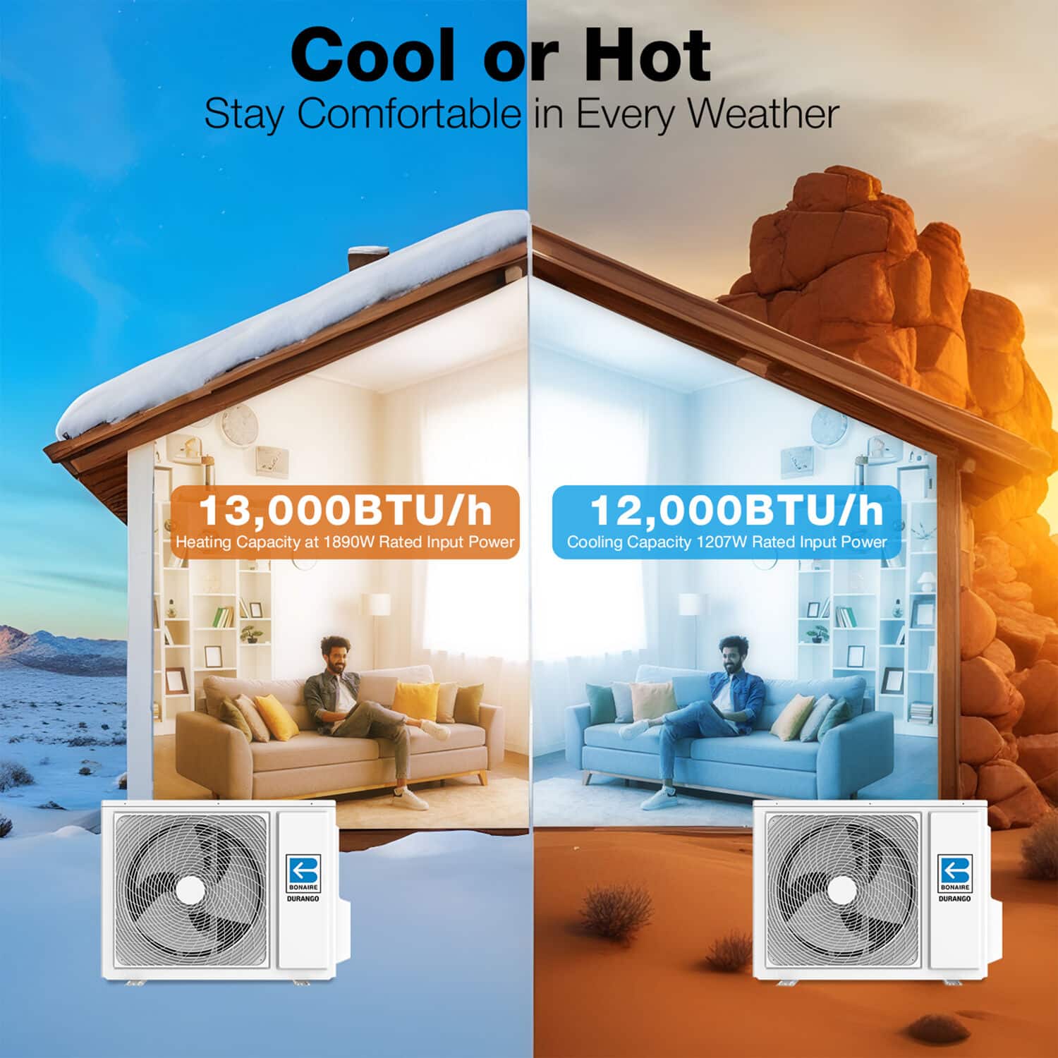 Stay cool and comfortable in your home or office all year long with the Bonaire Durango Ductless Mini Split Air Conditioner. This mini split AC is equipped with a 12,000 BTU cooling capacity and 13,000 BTU supplemental heater, so you can maintain optimal temperatures in your space throughout every season. Its inverter technology offers better performance and efficiency than traditional compressors, and with its low ambient heating mode, it can operate even in temperatures as low as -4 °F. Plus, it’s designed to operate quietly in the background so you can keep it running day and night without disrupting your work or sleep routines. The 12,000 BTU mini split AC comes equipped with several helpful features for added convenience, including Wi-Fi compatibility and Turbo and Dry modes that expedite cooling and reduce humidity. It’s also easy to setup and comes with all the components you’ll need for DIY installation.