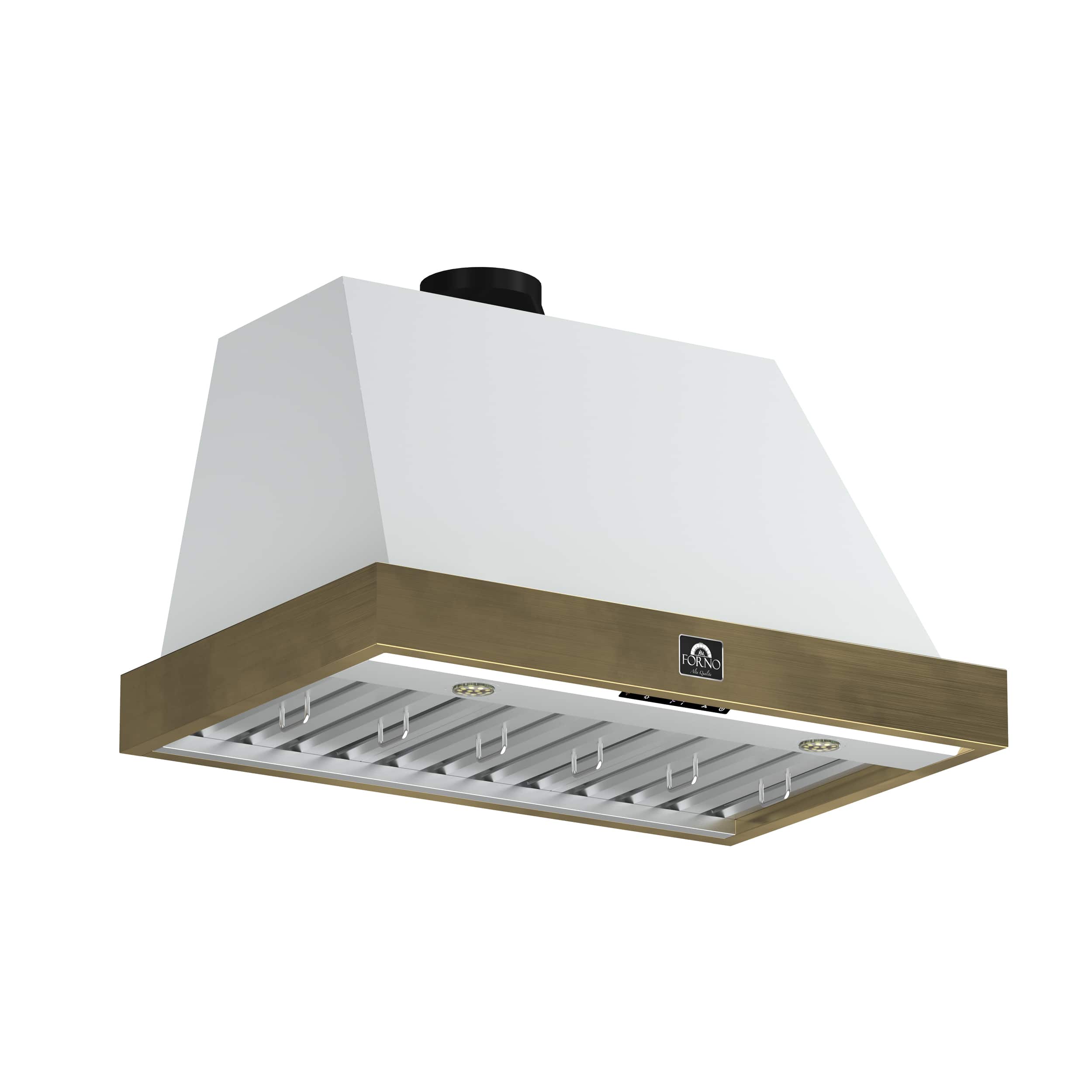 Enhance your kitchen with the Vittorio 36" Range Hood, combining style and performance. With a powerful 600 CFM motor, it efficiently removes smoke, odors, and grease, keeping your kitchen fresh. The 3-speed fan control adapts to any cooking situation, while dishwasher-safe baffle filters make cleanup easy. Enjoy convenient touch and remote controls for effortless operation, and energy-efficient LED lights that brighten your cooking area. The low-noise operation ensures a peaceful kitchen environment. The elegant white design with antique brass detailing adds a vintage touch to your space. Designed for flexible installation, the Vittorio suits both wall-mounted and under-cabinet setups. The 3-minute power-off delay ensures fresh air even after cooking. With a 2-year warranty covering parts and labor, this range hood delivers reliable performance and peace of mind. Lower the cost of living with Forno.