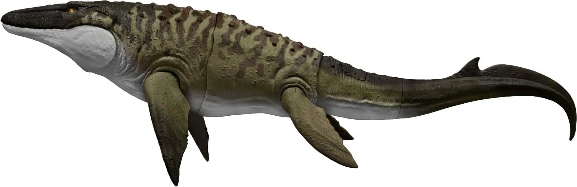 This Bite 'N Blast Mosasaurus dinosaur action figure with its distinctive aquatic design brings the excitement of Jurassic World Rebirth home. A button-activated "Bite" feature allows dramatic re-enactment of movie scenes and inspires creative play. Kids can control the attack by holding the tail and pressing the button to make the jaw open wide to bite – the mini Dilophosaurus figure that's included can be completely "swallowed" into the large Mosasaurus body! Press the button again to "Blast" the prey back out! With movable joints and movie-accurate design on the 25.7-inch long Mosasaurus, it's ready for both play and display. Scan the Tracking Code under the fin in the free Jurassic World Play App with a compatible smart device (Android or iOS, not included) to unlock a digital version of the dinosaur and play the fiercely fun game to race various vehicles on land, air and sea.