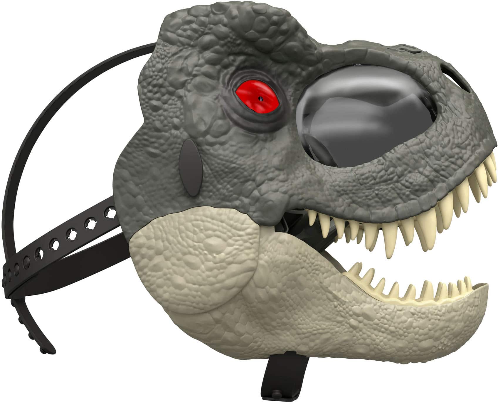 out of Jurassic World Rebirth and 3 levels of Rage 'N Roar effects! With authentic movie design, this Tyrannosaurus rex mask is intimidating even in its "resting" state – with ferocious teeth, blinking eyes and soft growl sounds. The light-up eye effects increase with three levels of aggression and increasingly fierce growls as the jaw is opened! It's fierce, it's fiercer, watch OUT! This role play mask will light up any Jurassic World fan 6 years and older. Eye and mouth openings provide easy wearability and an adjustable strap provides a secure fit.