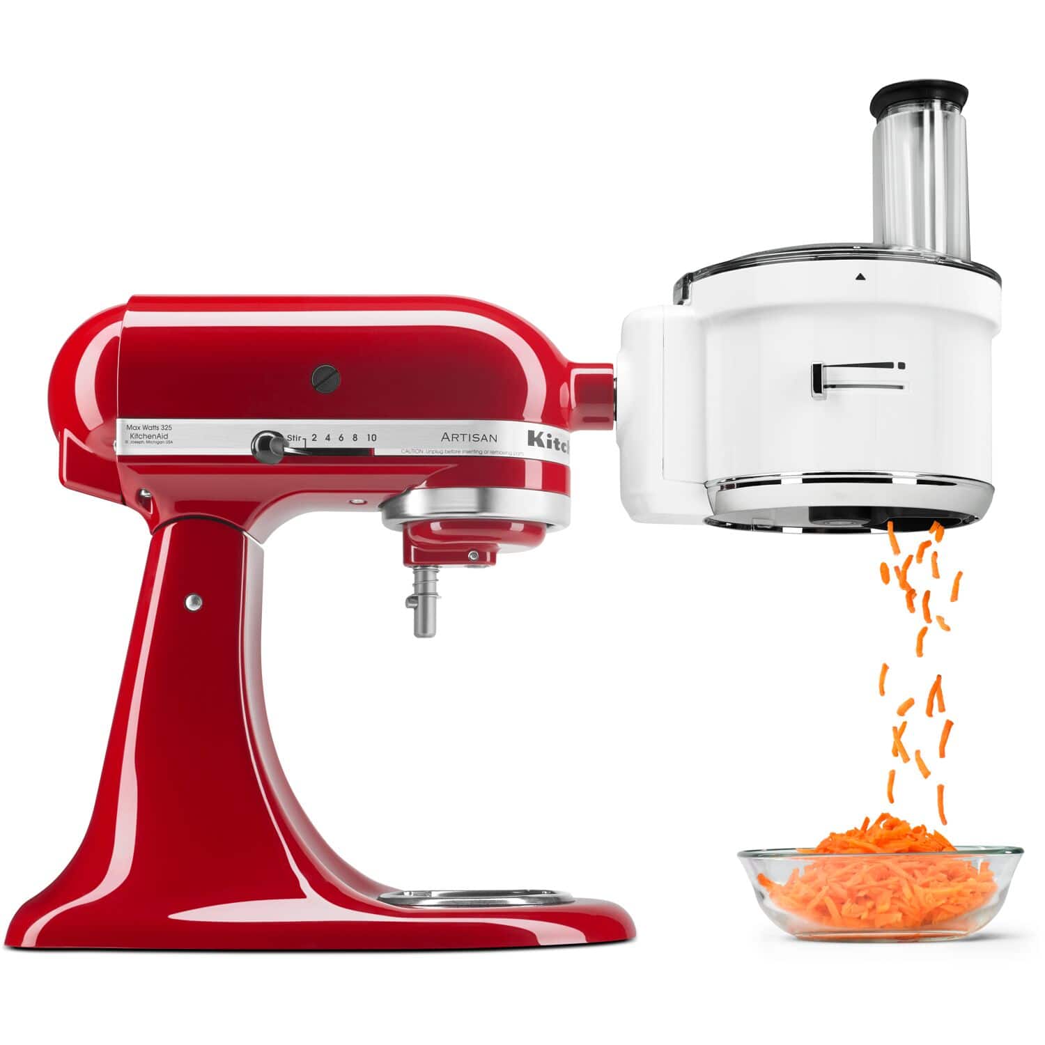 On sale • save 22%Get processing with your KitchenAid Stand Mixer. The Food Processor Attachment simply attaches to the hub of your stand mixer to slice, shred and julienne your favorite fruits, vegetables and hard cheeses. The exclusive ExactSlice System allows you to slice from thick to thin with one slide of the lever.