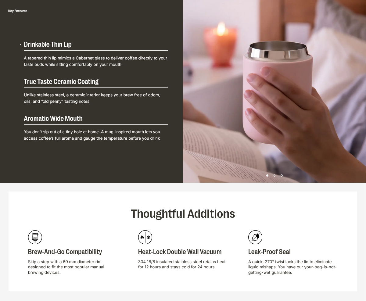 We never understood why to-go tumblers made design decisions that compromised the coffee drinking experience. The senses–taste, smell, and touch–were ignored, while durability and extreme heat retention were prioritized. Why not both? Introducing Carter Wide Mug, a travel tumbler finally worthy of the coffee inside. Designed to amplify the senses and engineered to fit manual brewing devices, you can now enjoy coffee at its fullest, everywhere.