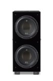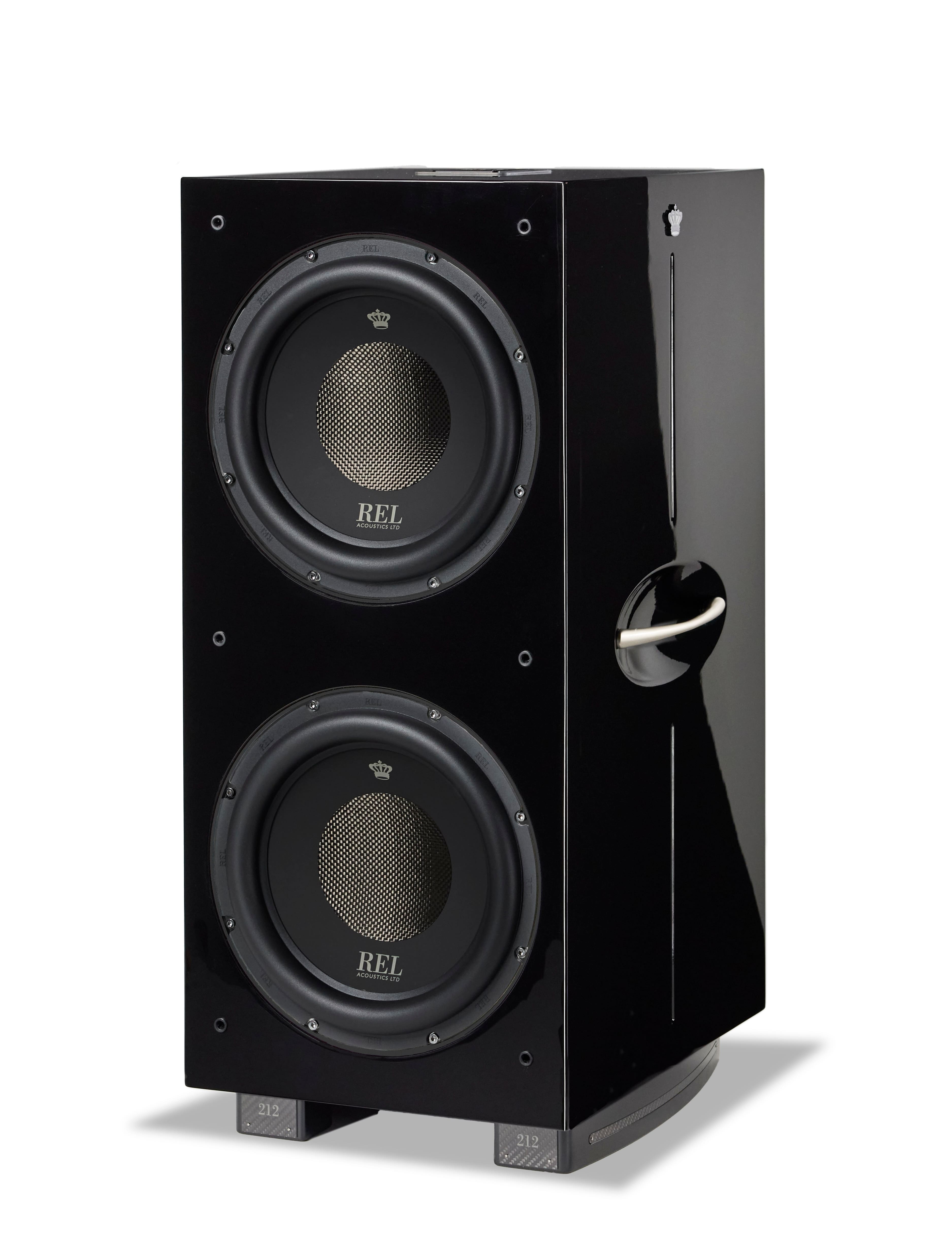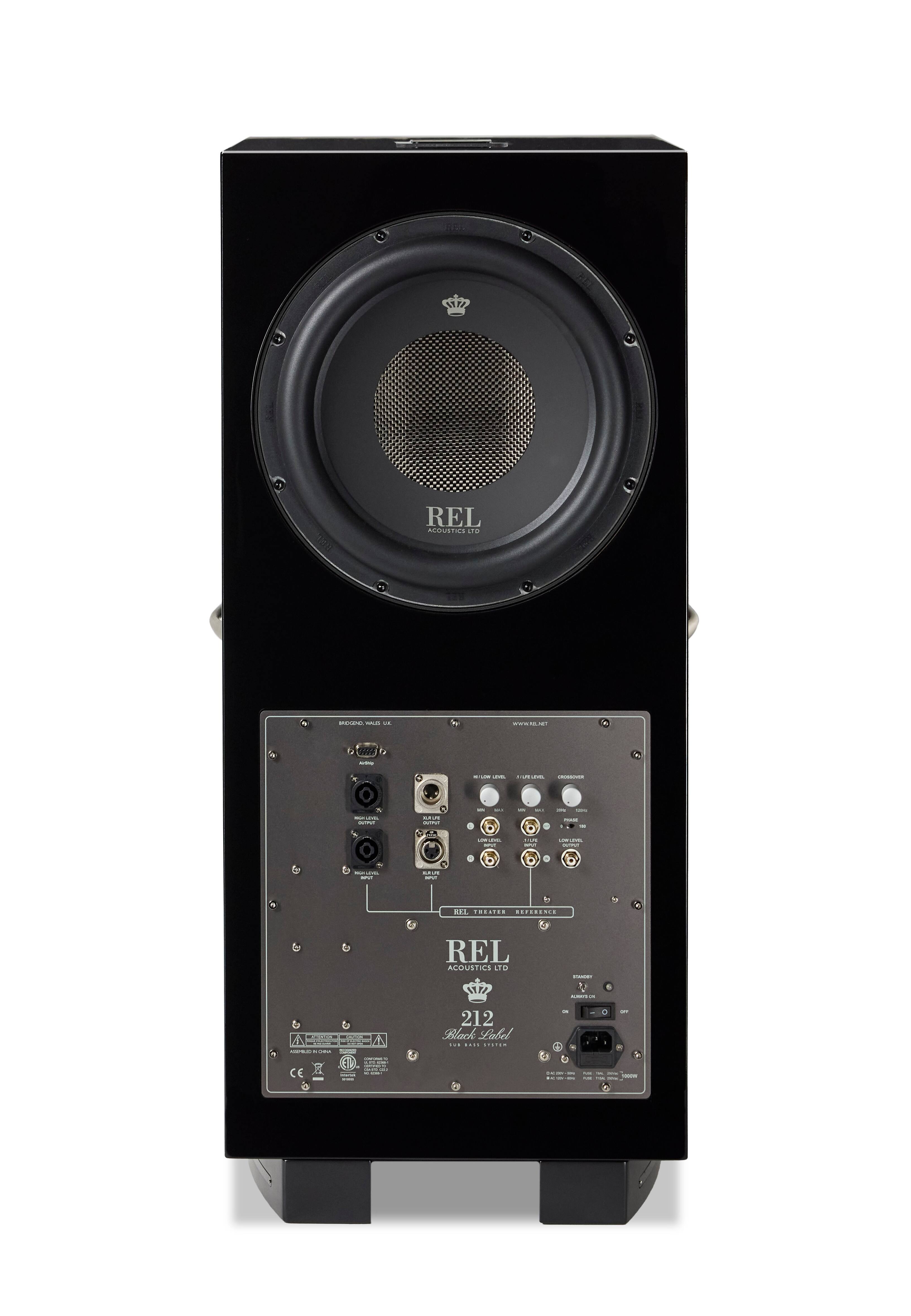 212 Black Label uses 1,000w amp driving 4 drivers total: (2) x vertically stacked Black anodized 12” CarbonAlloy ™active drivers +(1) downfiring CarbonAlloy passive +(1) upper-rear 12” passive for massive output. Awesome for music or big theatre. Piano Black lacquer cabinet, optional premium wood grille and wireless available.