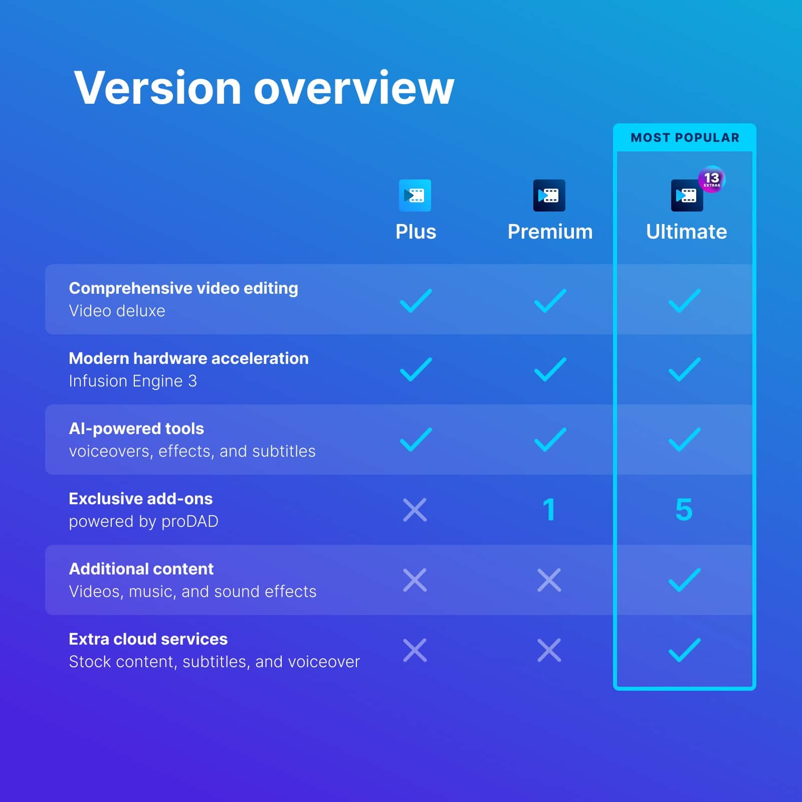 On sale • save 36%Video deluxe 2026 Premium makes advanced video editing feel easy. Discover intuitive editing tools, the seamless all-in-one media window and the proDAD VitaScene V5 Pro effects suite with over 1,700 effects, filters and transitions for impressive cinematic results. Use AI-generated subtitles and voiceovers and browse premium stock content for your B-roll scenes. New features: Make your subtitles pop with the Highlight function, organize your footage with AI media management and access exclusive content— including customizable LUTs, music tracks and sound effects.