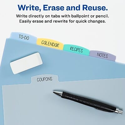 Write, erase and reuse these Avery 5-Tab Write & Erase Mini Dividers to your heart's content. Each mini binder divider is made of durable, tear-resistant PVC-free plastic designed to hold up to frequent referencing. Write directly on the divider tabs with a ballpoint pen or pencil, and erase when you're ready to repurpose your page divider for the next project. Each divider in this 5-tab set features a fun pastel color that is sure to stand out when you open your binder, and is perfect for color coding and quick identification. The 5 1/2" x 8 1/2" mini binder dividers with tabs are 7-hole punched for immediate use in 3 ring and 7 ring mini binders and planners. Built to withstand everyday use, this set of write-on 5-tab dividers is great for homework organization, personal finance planning, recipe binder dividers, as a coupon organizer, or anything else that needs sorting.