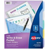 Write, erase and reuse these Avery 5-Tab Write & Erase Pocket Dividers to your heart's content. The wide design works perfectly with sheet protectors so that you can still view your tabs at a glance. Each 3 ring binder divider is made of durable, tear-resistant PVC-free plastic designed to hold up to frequent referencing. Write directly on the multicolor divider tabs with a ballpoint pen or pencil, and erase when you're ready to repurpose your page divider for the next project. The front pocket in each plastic divider is perfect for storing your loose, unpunched or smaller sized sheets, photos and documents. Each divider in this 5-tab set features a fun pastel color that is sure to stand out when you open your binder, and is perfect for color coding and quick identification. Tabbed dividers are 3-hole punched and ready for immediate use in standard 3 ring binders. This set of 5 write-on binder dividers is great for homework organization, personal finance planning, recipe binder dividers, as a coupon organizer, or anything else that needs sorting.