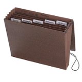 Expands to hold up to 1200 sheets. Leather like stock with tear resistant material reinforcement at top of gusset. Includes 1/5 cut colored vinyl tabs and inserts.