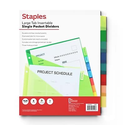 Keep your binders neat and tidy with these Staples Large Tab Plastic Insertable Dividers. Featuring eight multicolor tabs, these dividers make it easy to categorize and locate documents quickly. The durable plastic material ensures long-lasting use, while the built-in pockets provide additional storage for loose papers.