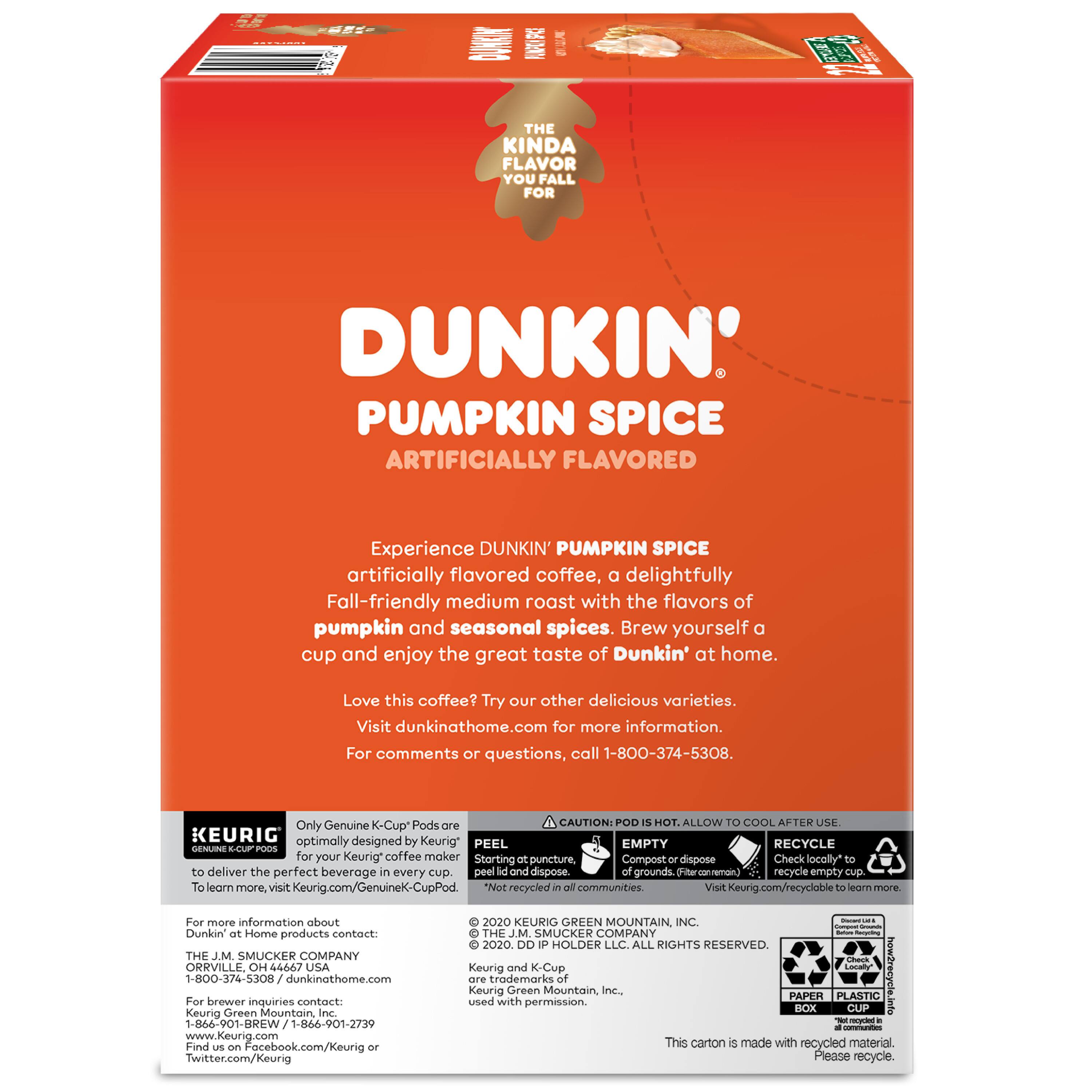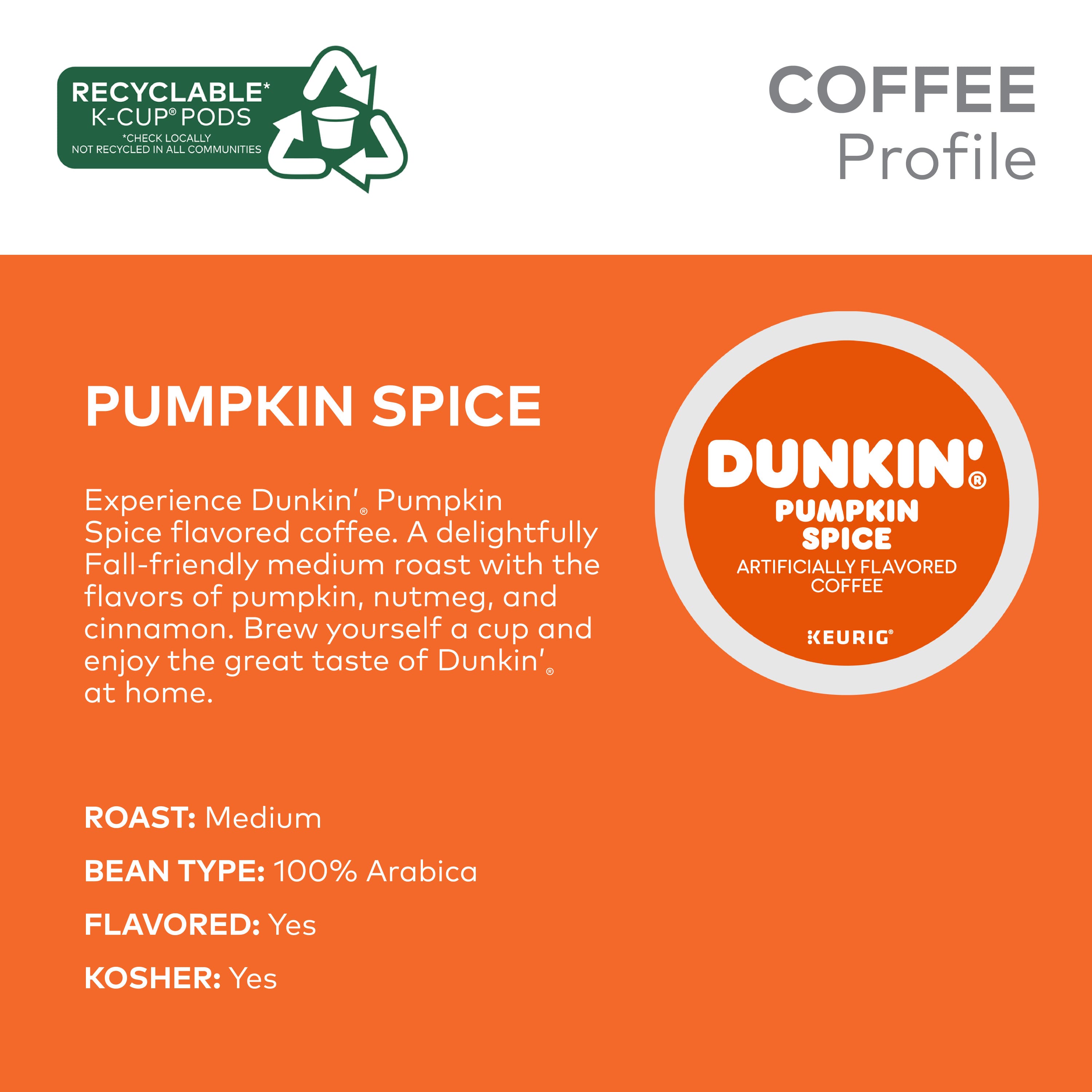 Spice up the season with fall flavors like pumpkin, nutmeg and cinnamon. Warm up with a cup of this Dunkin' Pumpkin Spice delicious, seasonal blend. Keurig K-Cup Pods made with 100% Premium Arabica Coffee.