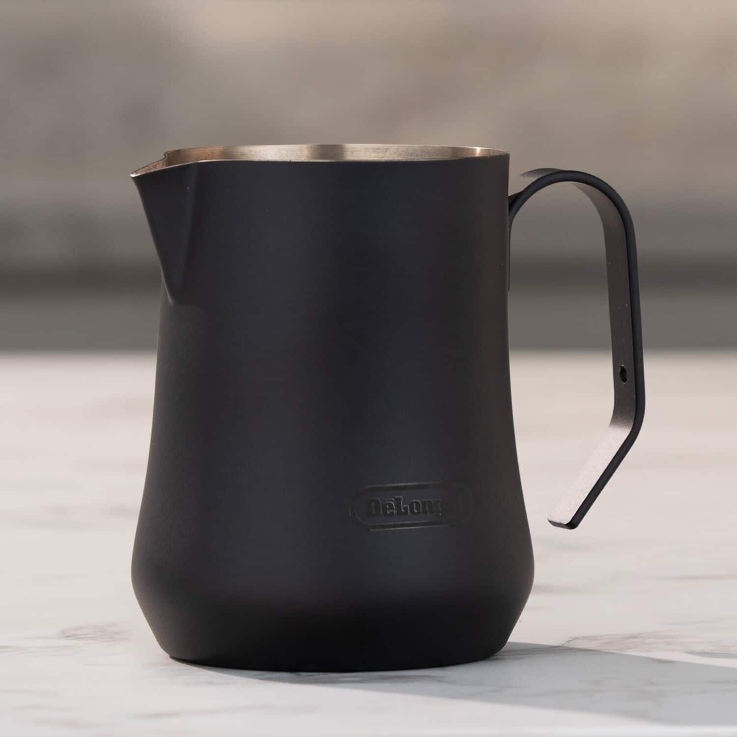The De’Longhi 500ml Milk Frothing Jug in sleek matte black is an essential tool for aspiring home baristas and espresso enthusiasts alike. This expertly crafted frothing pitcher puts the power of a professional barista in your hands. You can use it to create smooth, velvety milk foam for lattes, cappuccinos, flat whites, and more, all from the comfort of your kitchen. The innovative V-shaped spout ensures clean, controlled pouring to keep your coffee station mess-free and make it easier for you to create beautiful, café-style latte art. With a 500ml capacity, you can use it for single or multiple servings, and its compact footprint fits seamlessly into any coffee setup. The matte black stainless-steel finish adds a sophisticated touch to your counter, while the milk pitcher’s ergonomic, heat-resistant handle offers comfort and control with every pour. Made in Italy by the espresso experts at De’Longhi, this frothing jug combines functionality, durability, and aesthetics.