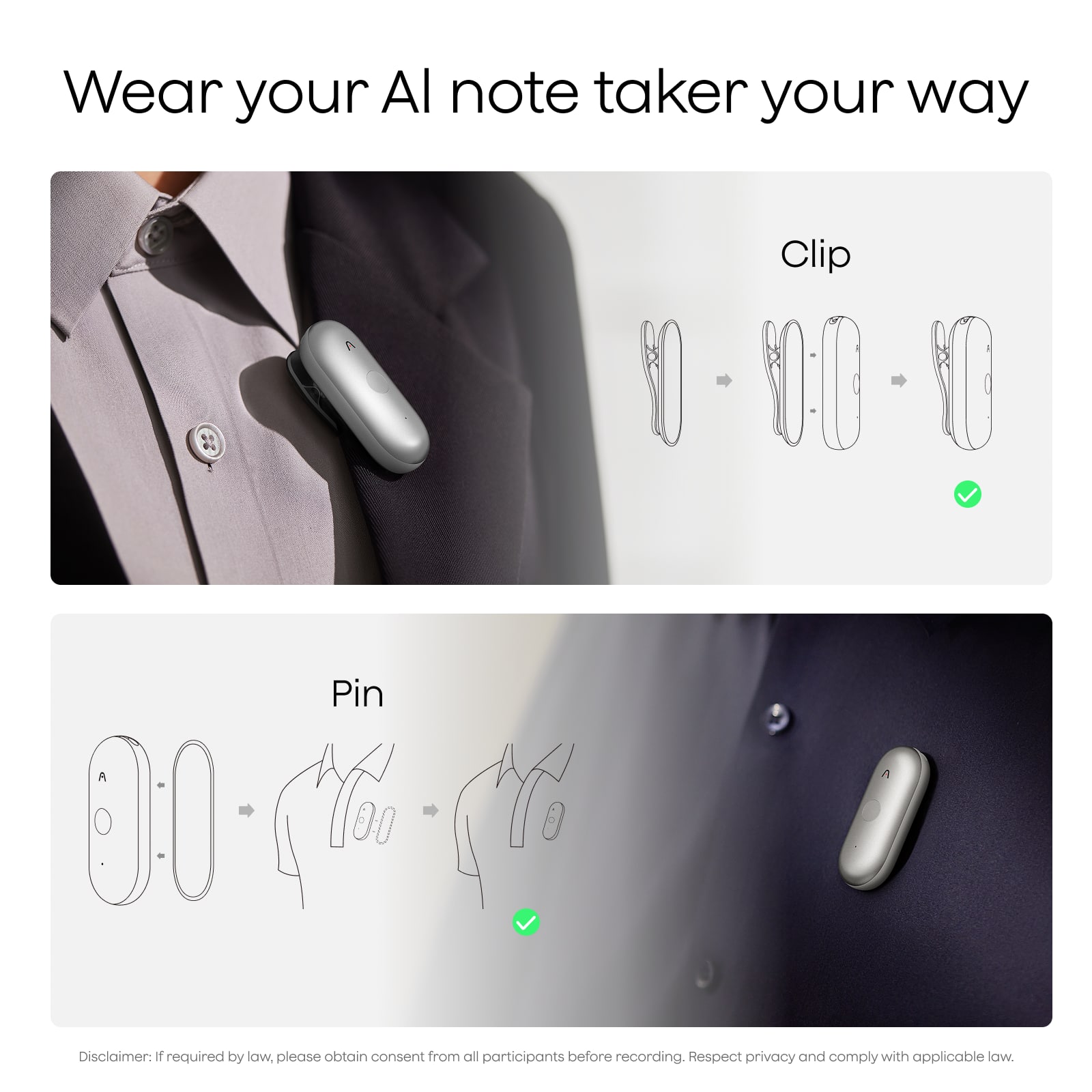 The Plaud NotePin S is a wearable AI-powered recorder designed to capture, transcribe, and summarize conversations effortlessly. Featuring Plaud Intelligence, it delivers accurate transcription in 112 languages with speaker labels and custom vocabulary, then generates multidimensional, role-specific summaries with 10,000+ templates, mind maps, and workflow integrations. Wear it as a pin, clip, necklace, or wristband for hands-free, all-day comfort. Despite weighing just 0.61 oz, it offers 20 hours of continuous recording, 40 days of standby, and 64GB of storage. Capture audio, notes, images, and highlights for richer context, and manage all recordings across Plaud App, Plaud Web, and Plaud Desktop. Enterprise-grade security standards including ISO 27001/27701, GDPR, SOC 2, HIPAA, and EN 18031 help keep your data private and secure. Includes a complete accessory kit and a free starter plan with 300 minutes of transcription per month, with upgrade options for more minutes and advanced AI features.