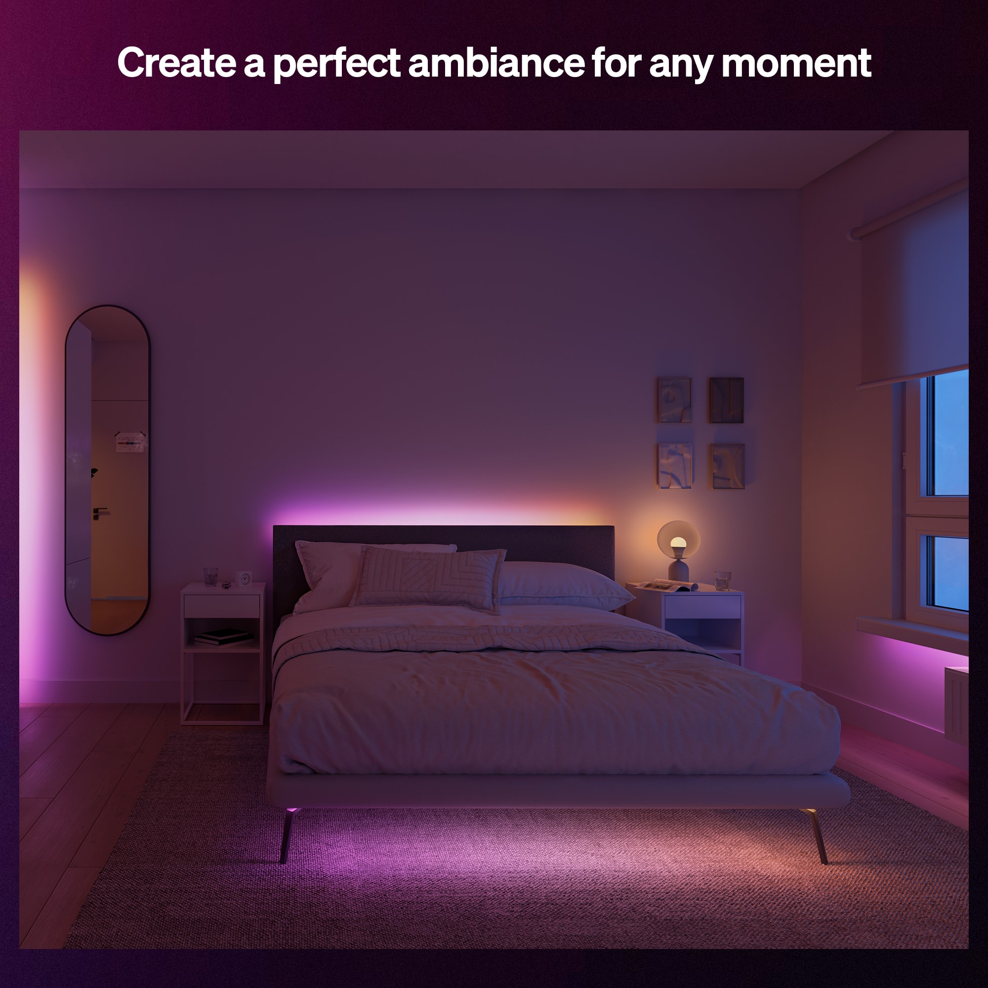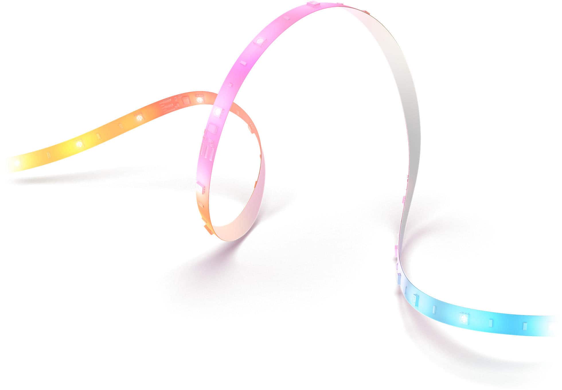 The Hue Essential strip light is the simple and accessible way to bring decorative lighting to any space inside your home without compromising light quality. The Essential strip light creates a beautiful ambiance by washing walls with a gradient of colorful light to match every mood or occasion. Easily install and conceal the strip light behind TV setups, under bookshelves, or behind bedroom furniture. Customize the strip light by cutting it to perfectly fit any space. Take the first step into the world of Hue smart lighting — control with the Hue app or by using your voice with a Smart Home assistant, set automations, and choose from dozens of light scenes.
