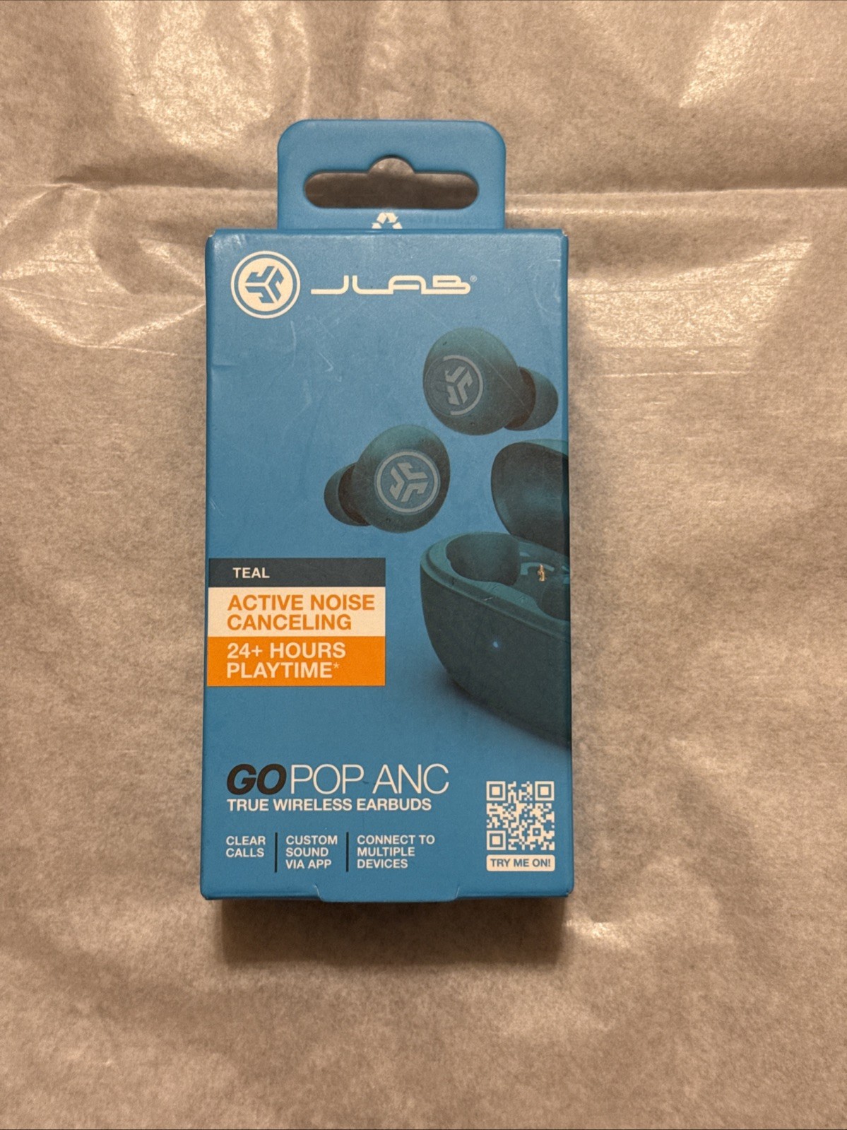JLab Go Pop ANC True Wireless Bluetooth Earbuds - Transparent/Clear Teal. Condition is New. Shipped with UPS Ground Saver.