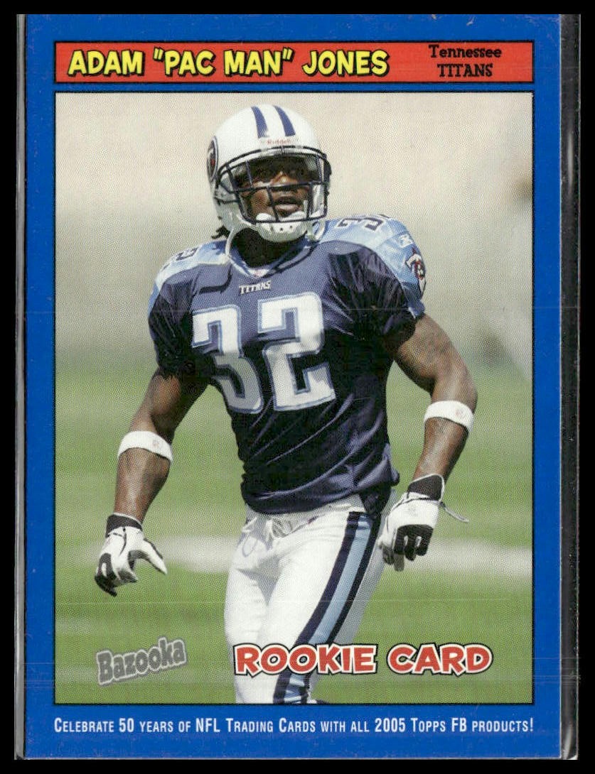 This is a nice example of a 2005 Bazooka #180 Adam "Pac Man" Jones Blue Other important information about this card: RC In 2005 Adam "Pac Man" Jones played for the Tennessee Titans. Please check out our other listings for more great cards.