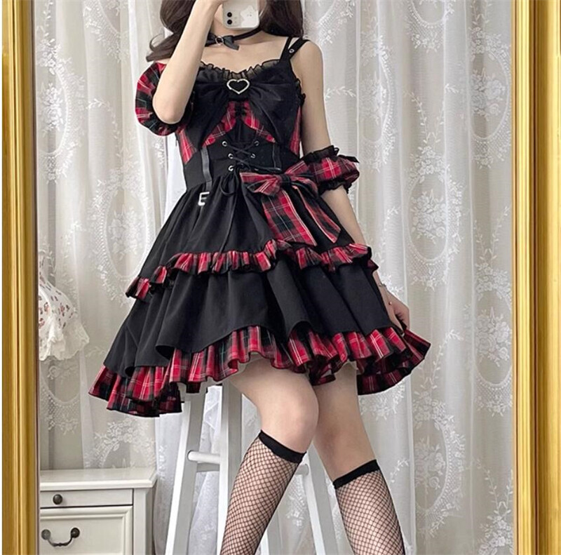 Japanese women Lolita Gothic plaid high waisted dress Bow ribbon suspender dress