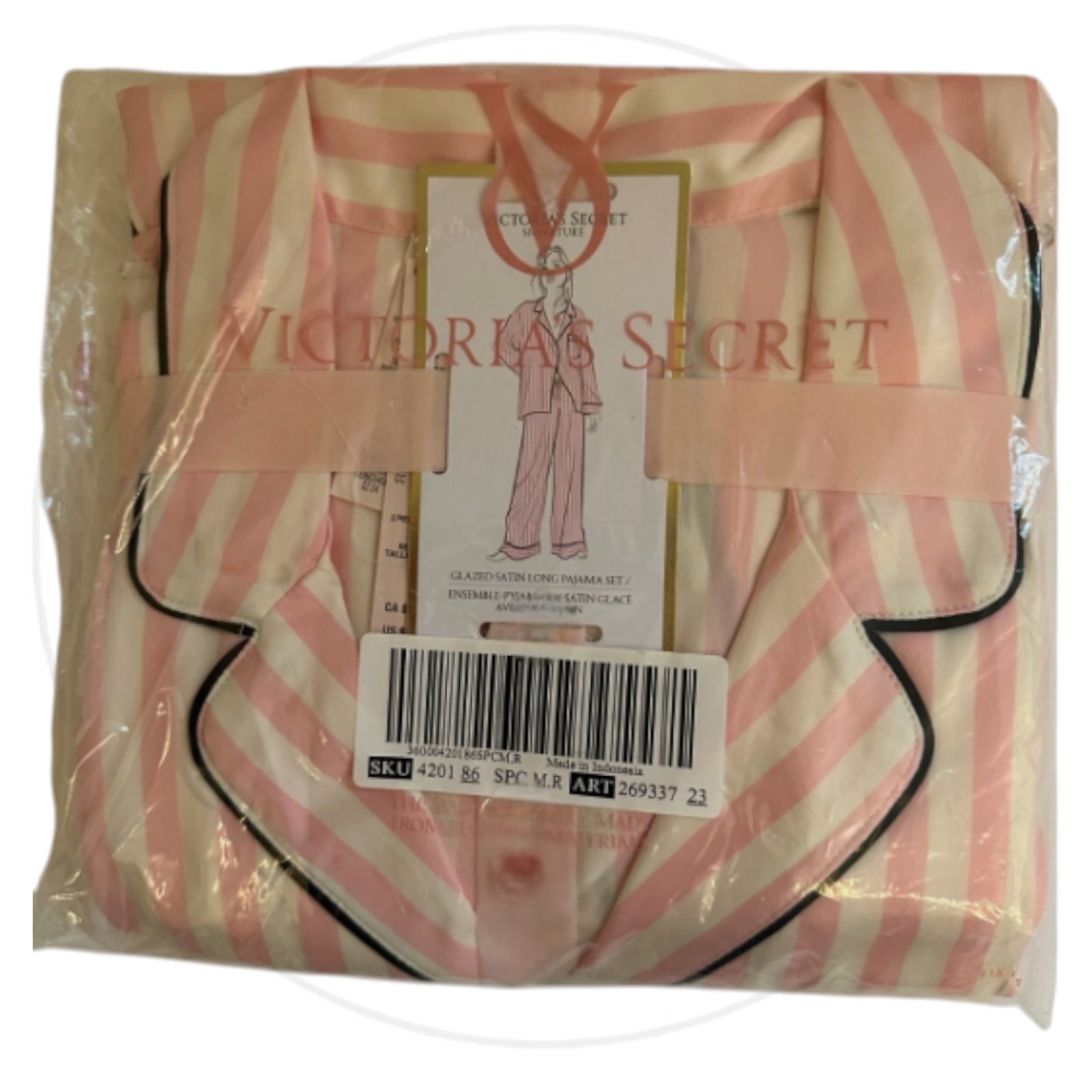 This NWT Victoria's Secret Glazed Satin Pajama set in Pink Iconic Stripe features a classic striped pattern on a lightweight satin fabric, perfect for summer, fall, and spring seasons. The set includes pants or shorts, with a button closure, collared neckline, and long sleeves for comfort and style. Made of polyester satin, this pajama set is machine washable for easy care and comes in sizes M and L, making it a versatile and stylish addition to any woman's sleepwear collection.