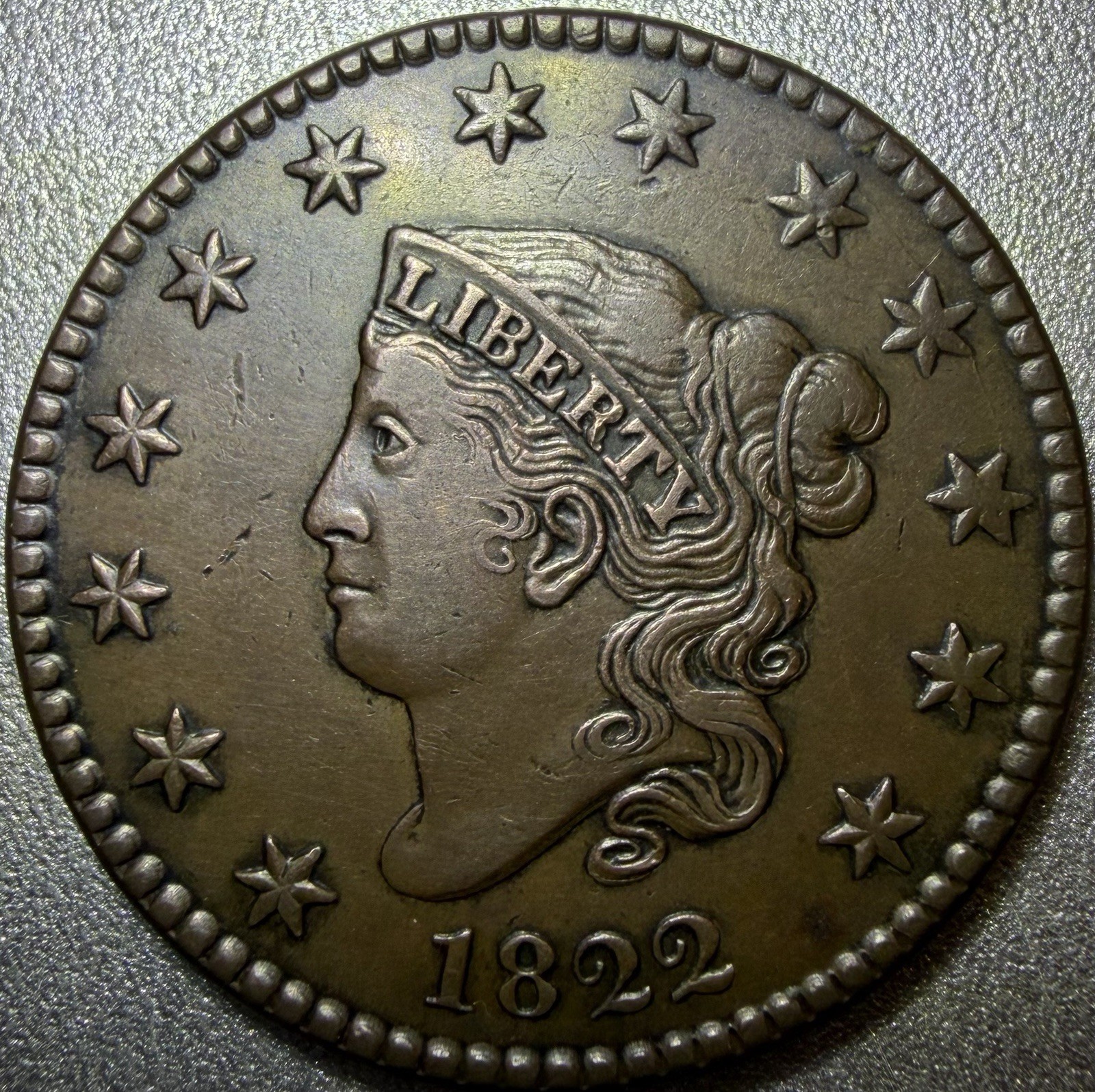 1822 Coronet Head Copper Cent 1c US Large Cent Coin Very Fine Circulated Philly