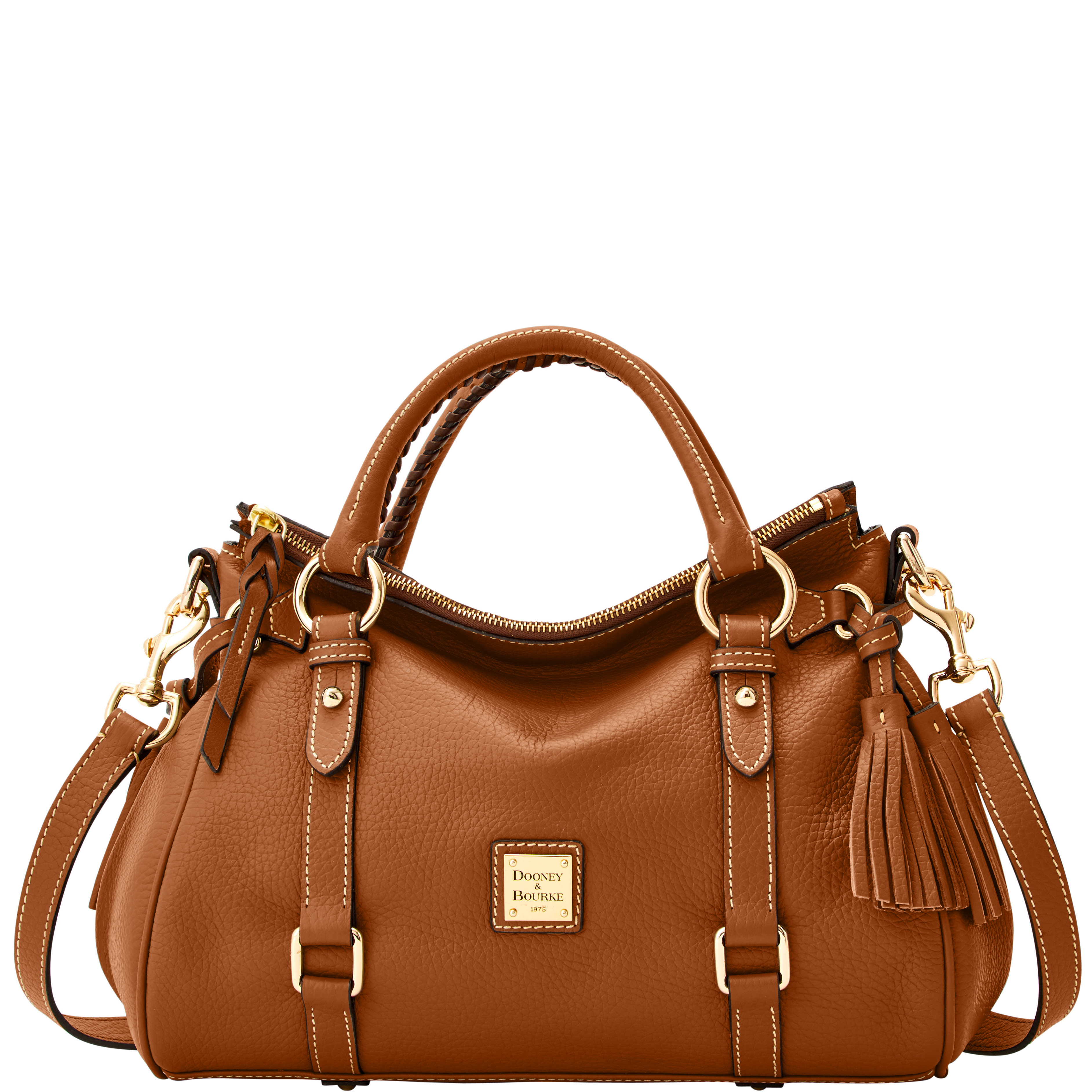On sale • save 30%Dooney & Bourke Pebble Grain Satchel | Caramel. One inside zip pocket. Two inside pockets. Cell phone pocket. Inside key hook. Handle drop length 4.5". Adjustable, detachable shoulder strap. Strap drop length 19". Lined. Feet. Zipper closure. Dooney & Bourke Pebble Grain Satchel | Caramel