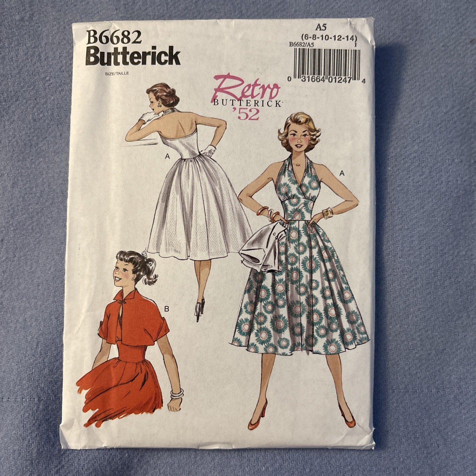 Ready for making new factory folded uncut Butterick sewing pattern, B6682, retro 1952 halter dress with bolero jacket Sizes 6-14, bust 30 1/2 to 36 inches. Average difficulty Clean smoke free environment