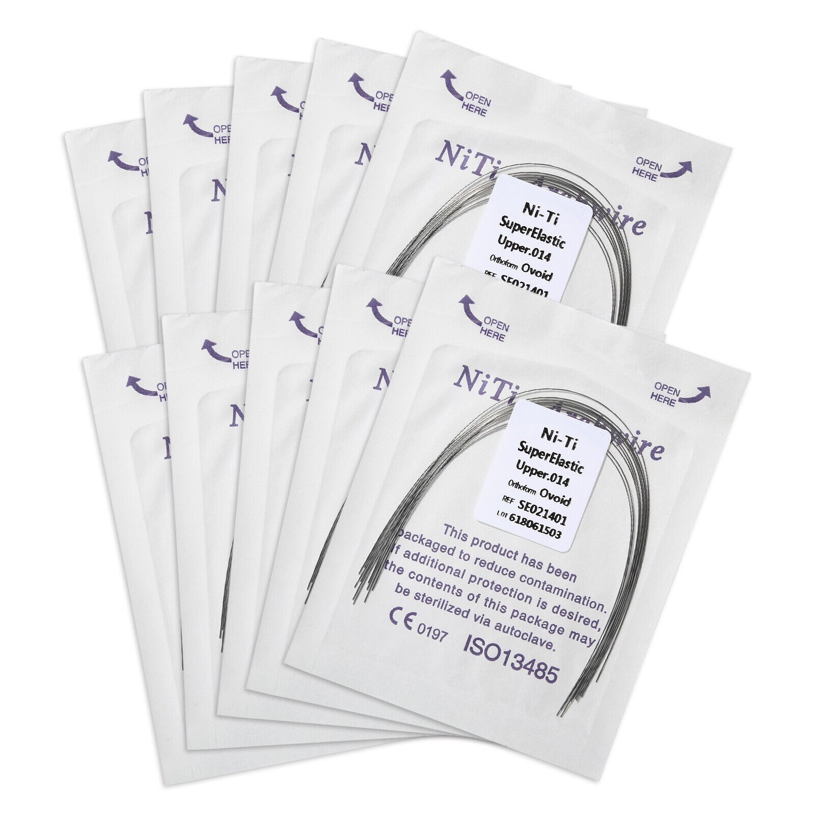 Orthodontic Super Elastic Niti Arch Wire (Round). Material: Super Elastic Niti. Form:Oval Form. 0.020 upper; 0.020 lower. 0.018 upper; 0.018 lower. 0.016 upper; 0.016 lower. 0.014 upper; 0.014 lower.