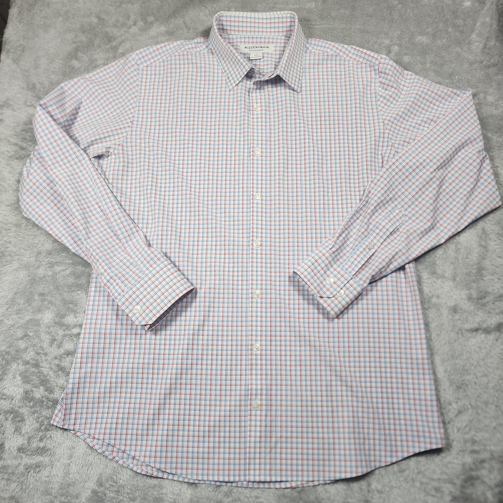 Brand: MIZZEN+MAIN Performance Menswear Item: Men's long-sleeve button-front shirt (classic fit) Size on tag: L (Classic) Color/Pattern: White base with blue and red check plaid Material: 85% Polyester, 15% Spandex (stretch performance fabric) Country of origin: Made in Indonesia Collar: Point collar Cuffs: Double-button barrel cuffs Hem: Curved shirttail hem Care instructions (from tag): Wash cold; hang dry; cool iron if needed; wash with like colors; gentle cycle Style/Model code: LEES2063004 Additional tag info: CUT # PO0000350 Notes: See photos for overall fit and approximate measurements shown for reference.