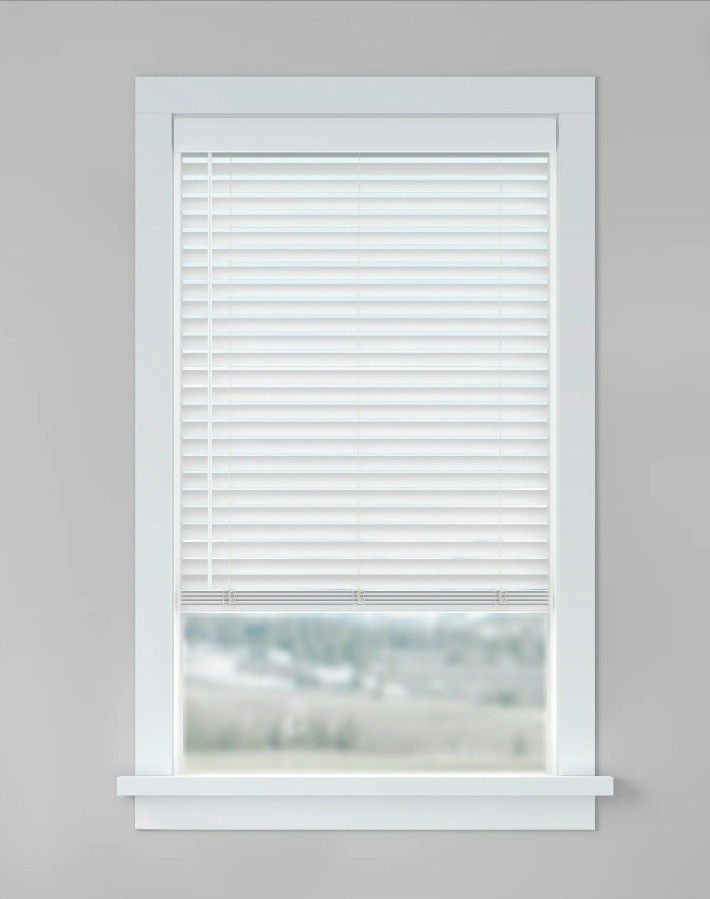 The LEVOLOR Trim+Go 2-in Slat Width 35-in x 48-in Cordless White Faux Wood Room Blinds are stylish and convenient window treatments that offer a modern look with the ease of cordless operation. Made from faux wood, these horizontal blinds are durable and resistant to moisture, making them suitable for various environments. With a sleek white color and 2-inch slat width, these blinds are designed to enhance the look of any room while providing privacy and light control. The 48-inch length ensures coverage for most standard window sizes, making them a versatile and practical choice for any home.