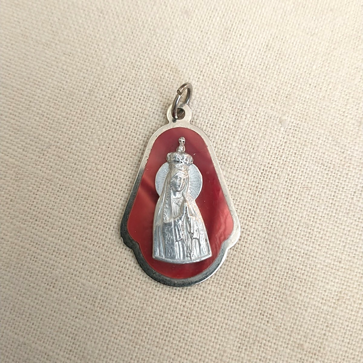 VTG Our Lady Of Fatima Pendant Charm Rosery Religious Silver Tone Red