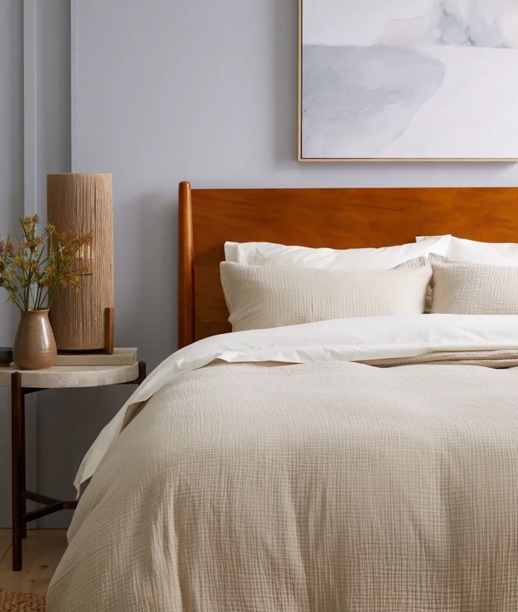 The Quince Organic Airy Guaze Twin Duvet Cover Set in Dune Color includes two shams and is made of soft cotton. This solid color duvet cover set is designed for a bedroom and is perfect for adding a touch of elegance to any room. The Quince brand ensures quality and the set is easy to care for, making it a great addition to any home. New Set includes 2 Shams