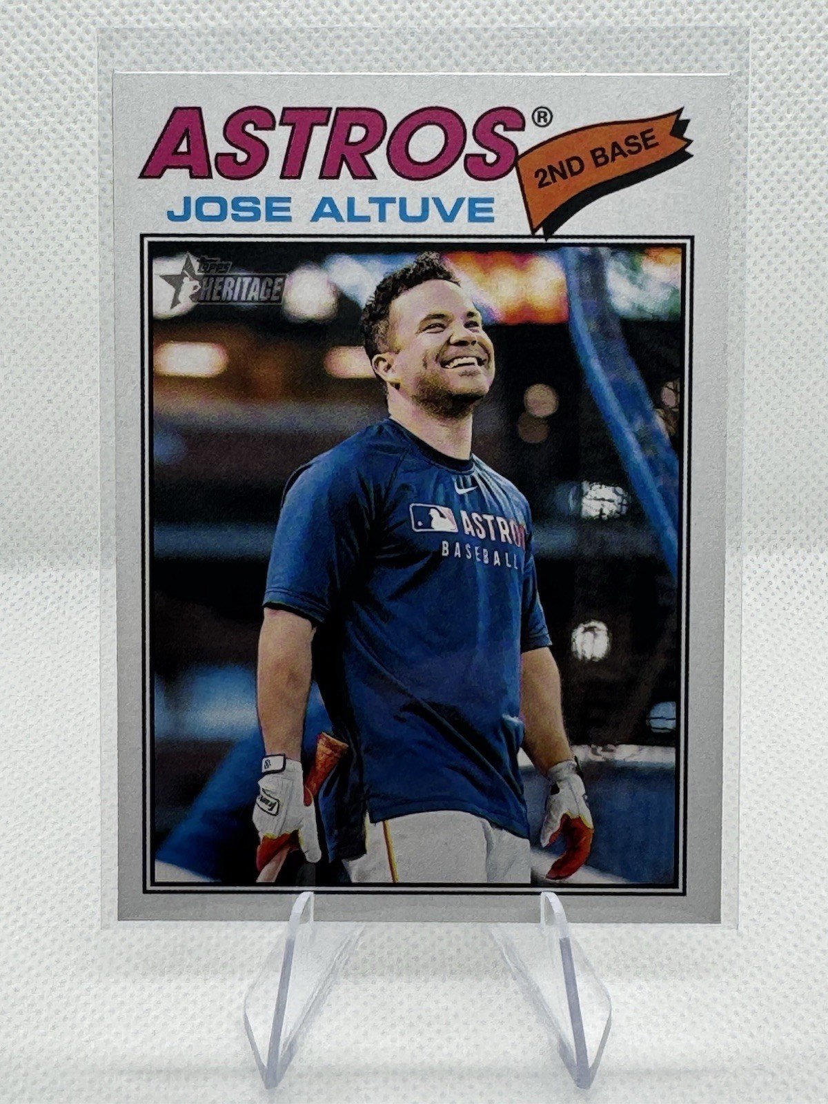 The product is a 2026 Topps Heritage Image Variation SP trading card featuring Major League Baseball player Jose Altuve from the Houston Astros. This original card is made of card stock with a thickness of 20 Pt. and is a part of the Image Variations parallel/variety. It is a standard-sized sports trading card in English language, featuring a short print design that makes it a sought-after collectible for fans and collectors of baseball memorabilia. Card is in near mint or better condition.